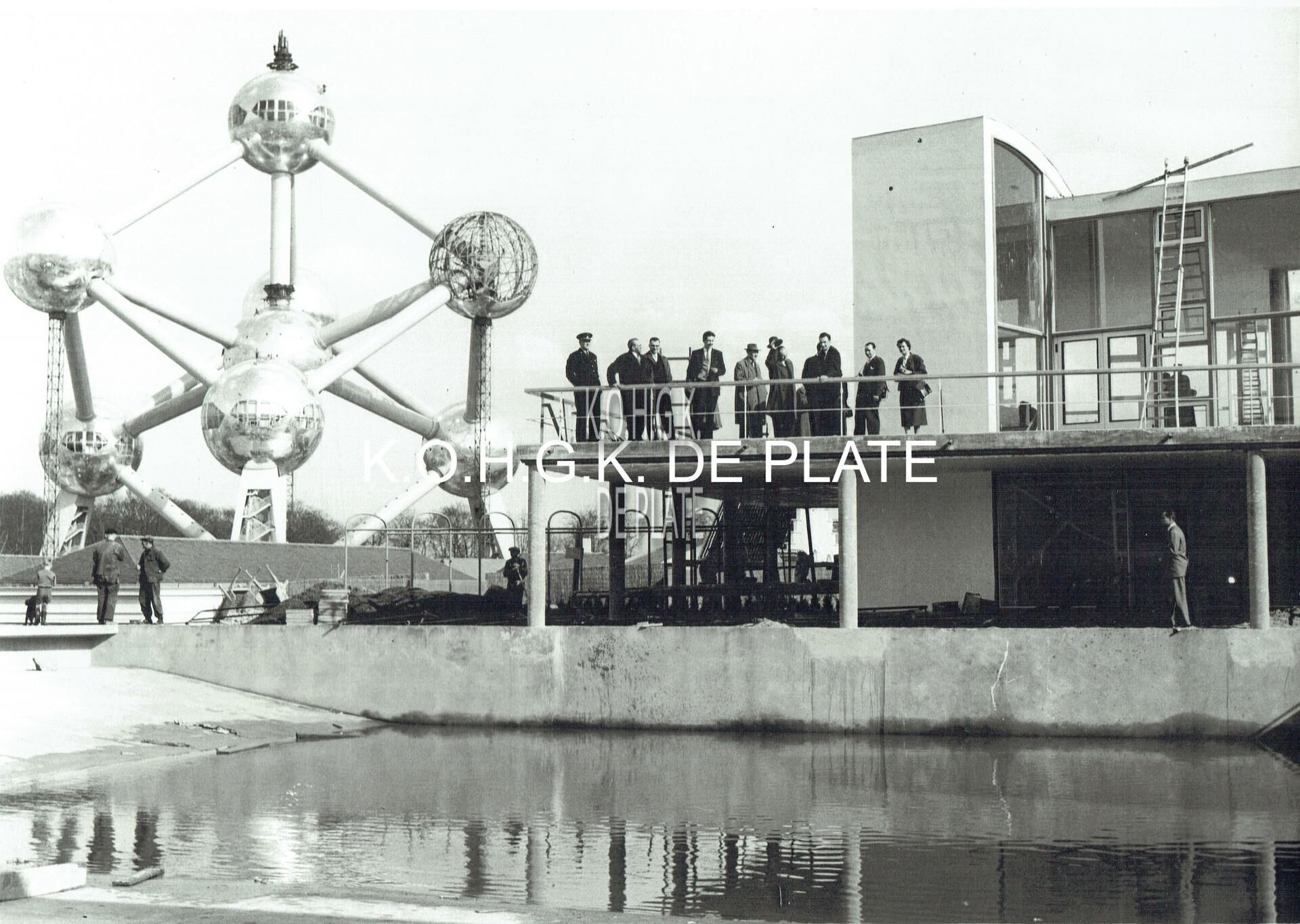 Vergroting. - Formaat : 30 x 40 cm. - Het Oostends paviljoen en het Atomium in opbouw