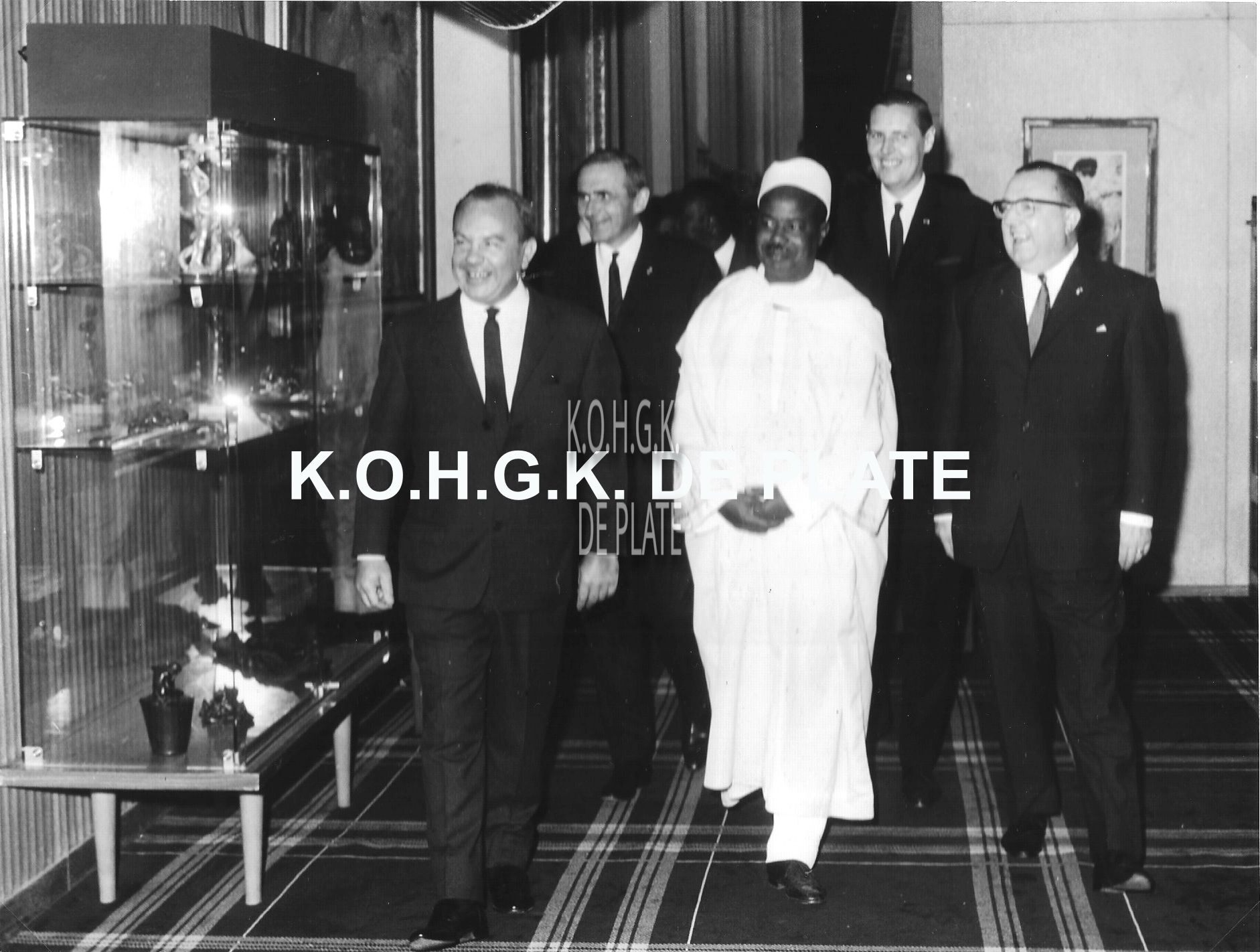 Formaat : 18 x 24 cm. Van links naar rechts, Emilien Michiels, directeur van de kursaal, Pierre van Outryve d'Ydewalle, de president van Kameroen, Jan Piers, minister-staatssecretaris Openbaar Ambt en Toerisme en John Lauwereins, waarnemend burgmeester. Ook was er de tentoonstelling "Europa 1900"