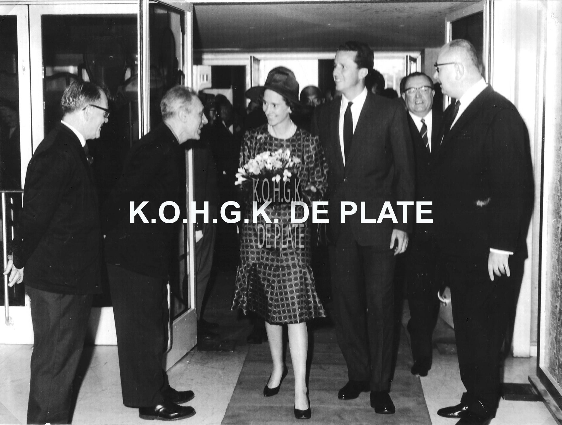 Formaat : 18 x 24 cm. - De koning en de koningin bij hun aankomst. Rechts, Roger De Ramée, directeur van de kursaal en achter hem, waarnemend burgemeester John Lauwereins