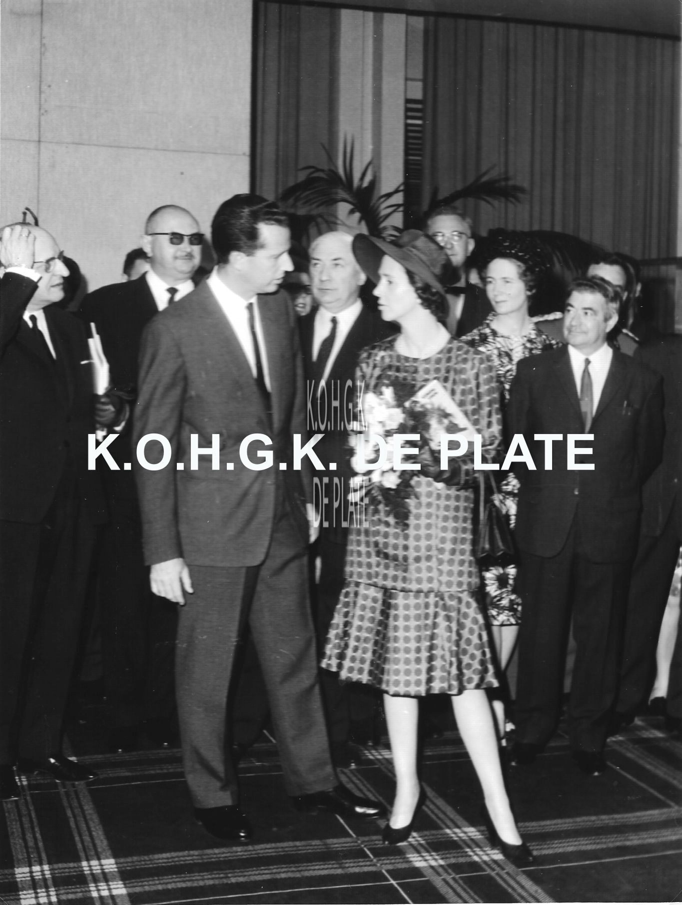 Formaat : 24 x 18 cm. - De koning en de koningin in gesprek. Achter hen, van links naar rechts, Théo Lefevre, Roger De Ramée, directeur van de kursaal en kunstschilder Felix Labisse