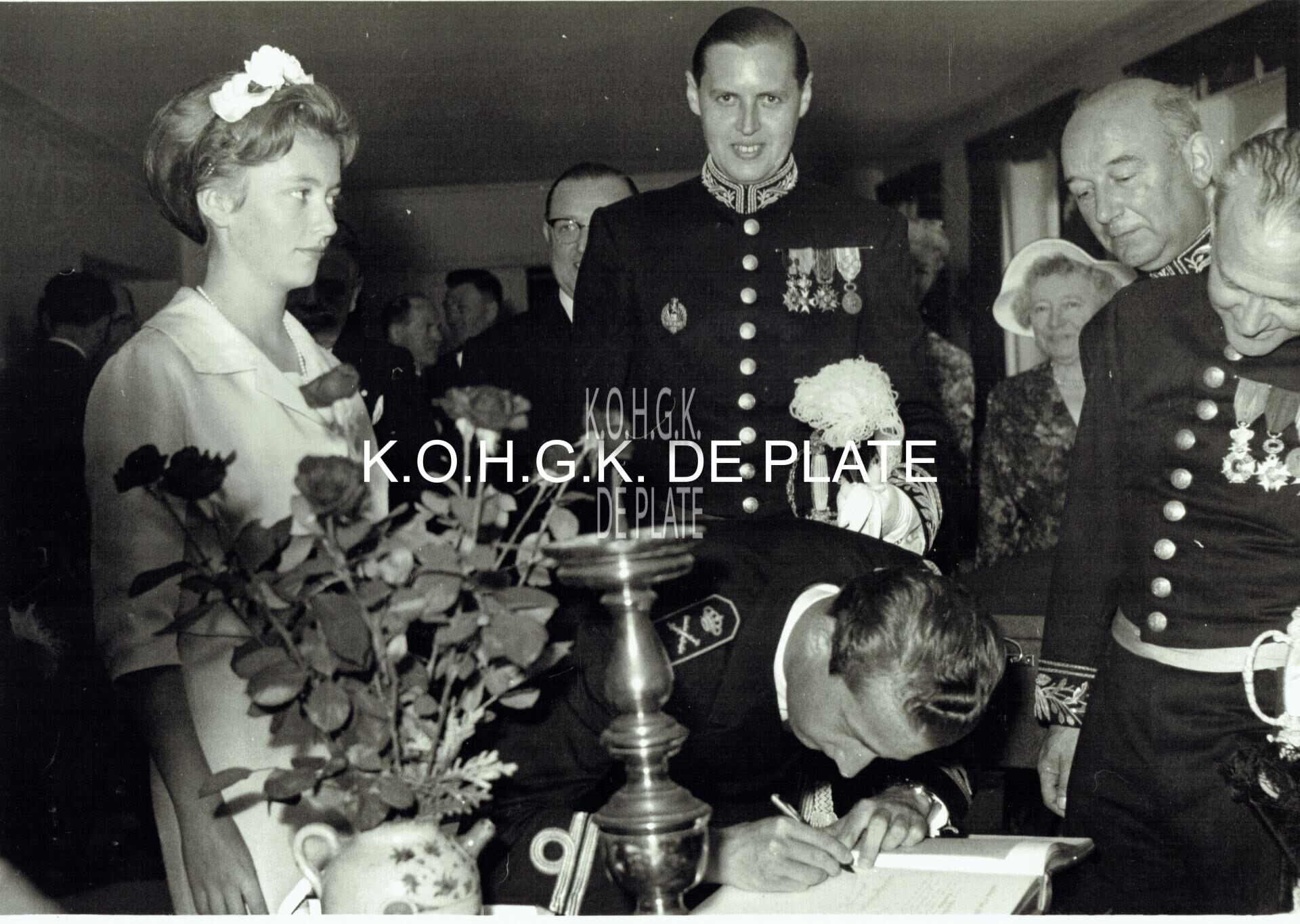 Vergroting. - Formaat : 28 x 40 cm. - Prins Albert tekent het gulden boek van de stad Oostende in de Koninklijke Villa tijdens zijn blijde intrede te Oostende met zijn aanstaande vrouw Prinses Paola. Centraal burgemeester Jan Piers. Uiterst rechts, de schepenen Frans Van Caillie en Kamiel Dehouck