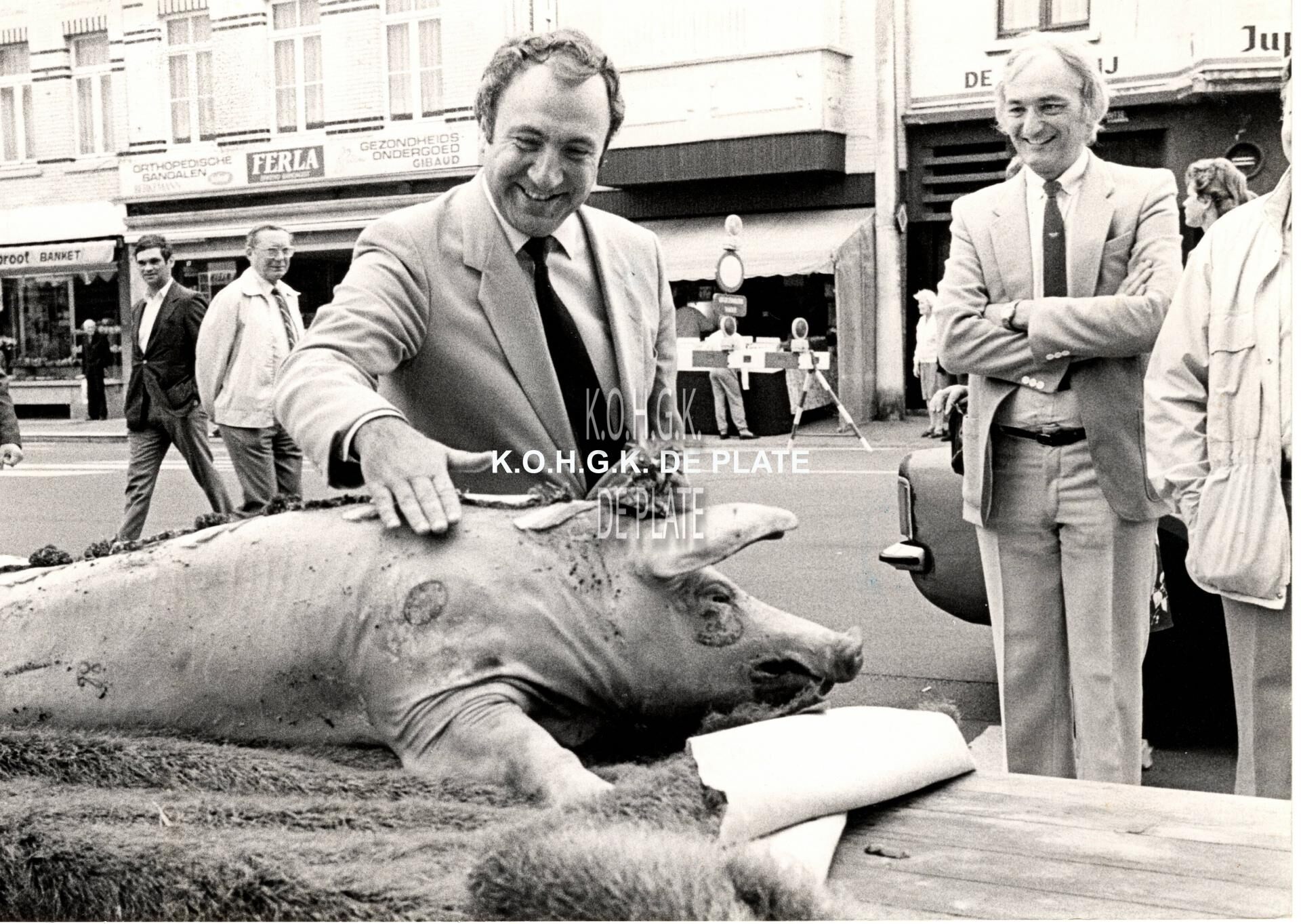 Formaat : 13 x 18 cm. - "Schepen Dries Vermeesch in het gezelschap van Willy Soenen van de firma Stevens Comfort, Torhoutsesteenweg 174. Uiterste links, Emmanuël Verlinde. Varken van slagerij Willy Deschildere, Torhoutsesteenweg 90F, voor de barbecue. Plaats : de Koninginnelaan tussen de Torhoutsesteenweg en het Prinses Clementinaplein" (Jan Nuytten)