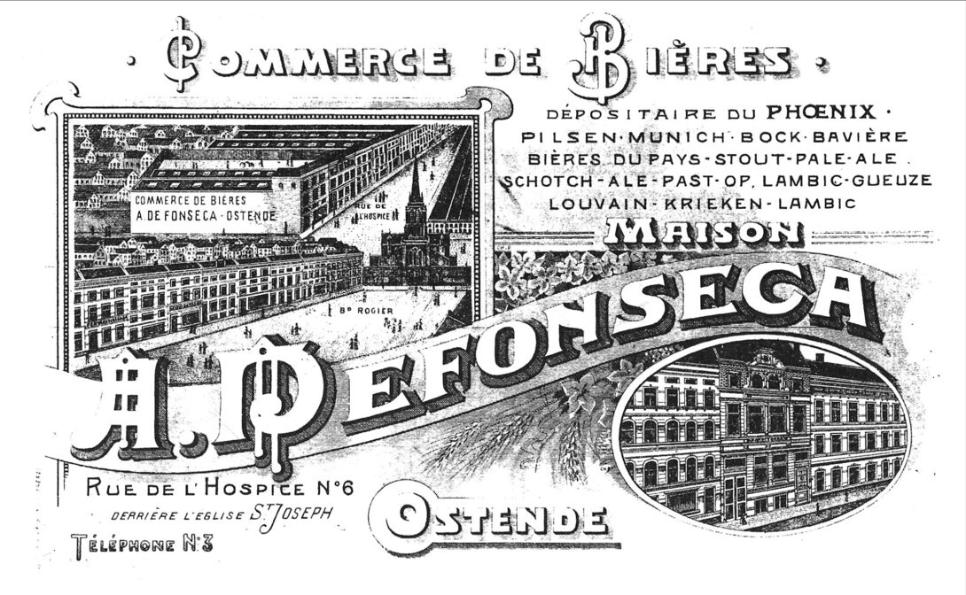 Commerce de bières. Dépositaire du Phoenix. Pilsen Munich, Bock, Bavière. Bières du pays, Stout, Pale-Ale, Schotch-Ale, Past-Op, Lambic-Gueuze, Louvain, Krieken-Lambic. Bierhandel gelegen in de Godshuizenstraat, vanaf juni 1926 Edith Cavellstraat.