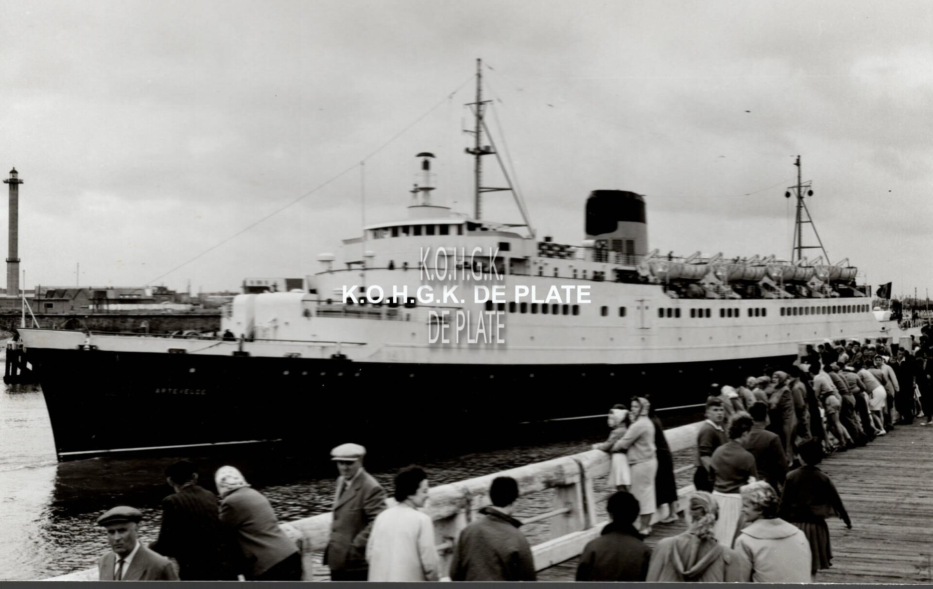 Formaat : 10 x 16, 5 cm. - Carferry "Artevelde" in de havengeul. in de voorgrond het Weststaketsel. In de achtergrond op de oosteroever, helemaal links vuurtoren "Lange Nelle".