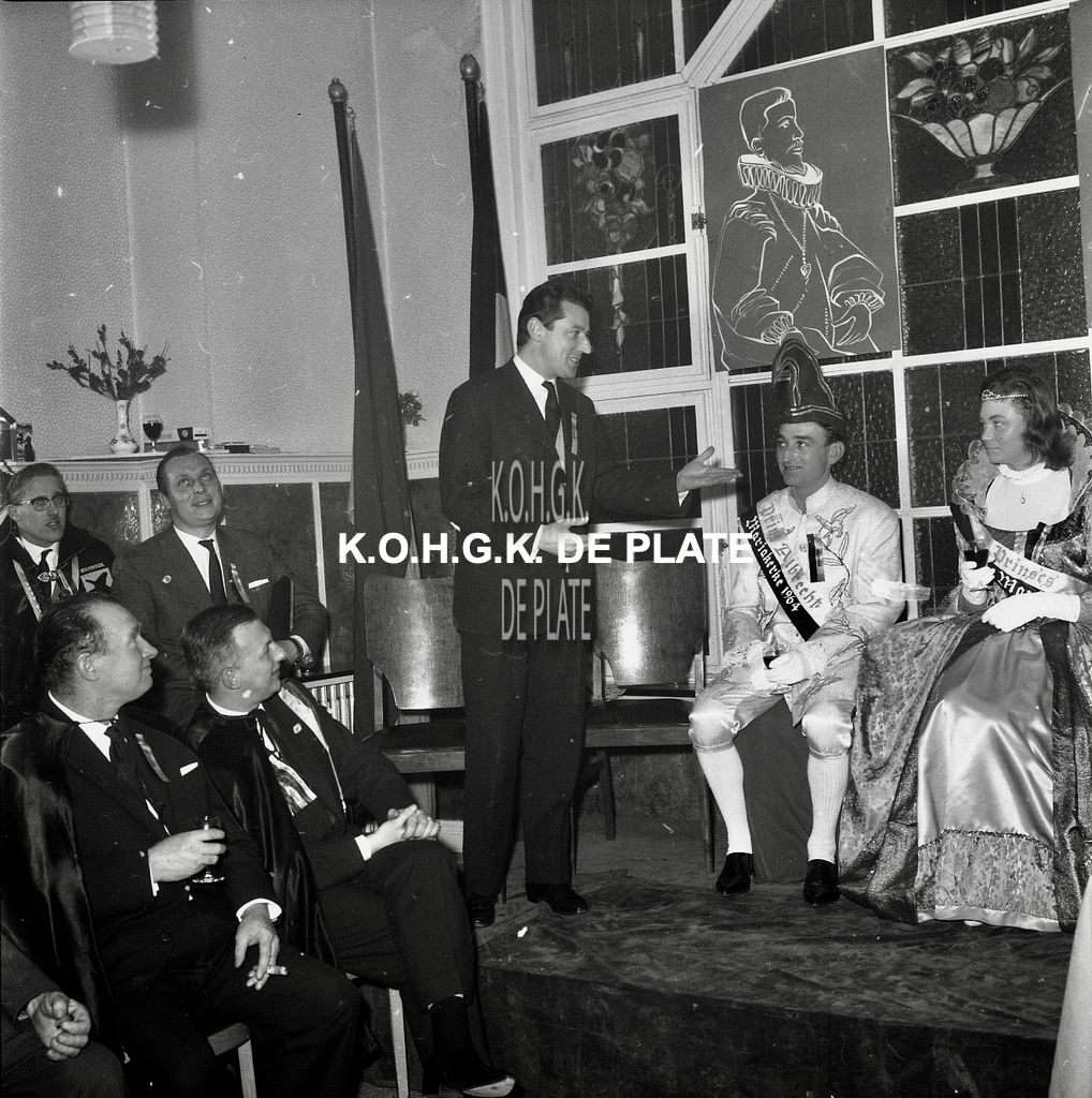 Negatief : 6 x 5,5 cm. - Het prinsenpaar Albrecht en Isabella van Mariakerke 1964. Marcel Friederichs zegt een woordje. Hier in Hotel du Kursaal te Mariakerke.