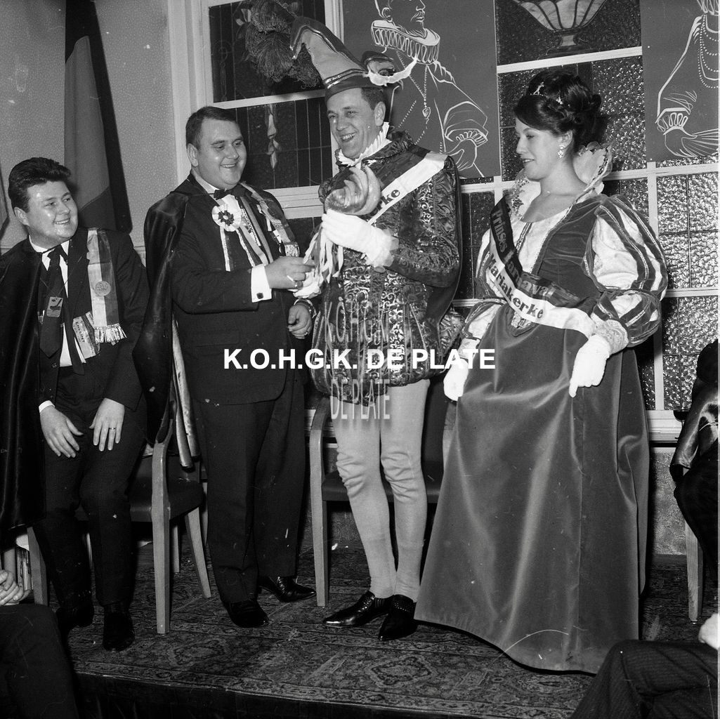 Negatief : 6 x 5,5 cm. - Het prinsenpaar Albrecht en Isabella van Mariakerke 1965. Naast, Norbert Van der Cruyssen van de "Orde der Sombrero's". Hier in Hotel du Kursaal te Mariakerke.