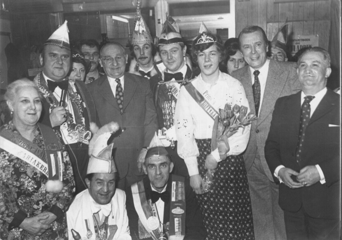 Verkiezing van het prinsenpaar Albrecht en Isabella van Mariakerke. Rechts, Georges Germonpré met naast hem Alfons Laridon. Links met de micro in zijn hand, Norbert Van der Cruyssen van de "Orde der Sombrero's" en naast hem, Karel Achtergaele