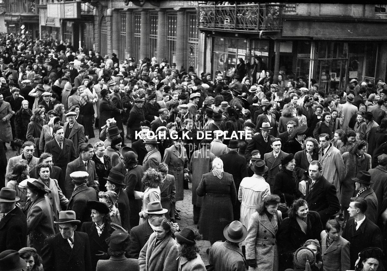 Negatief : 4 x 6,5 cm. - Veel volk op het Wapenplein naar aanleding van de halfvastenstoet. Rechts, de Adolf Buylstraat.