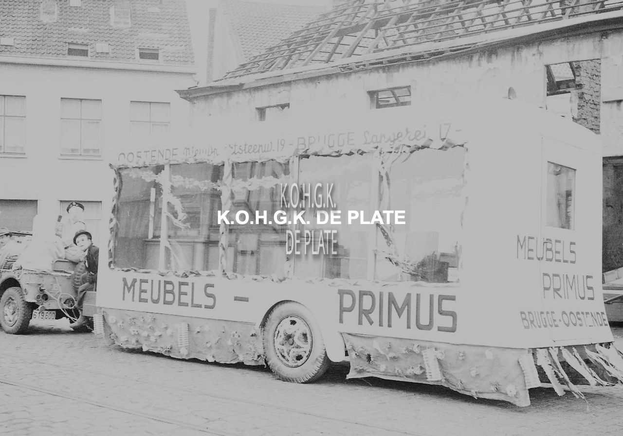 Negatief : 4 x 6,5 cm. - Publiciteitswagen van Meubels Primus op de Torhoutsesteenweg
