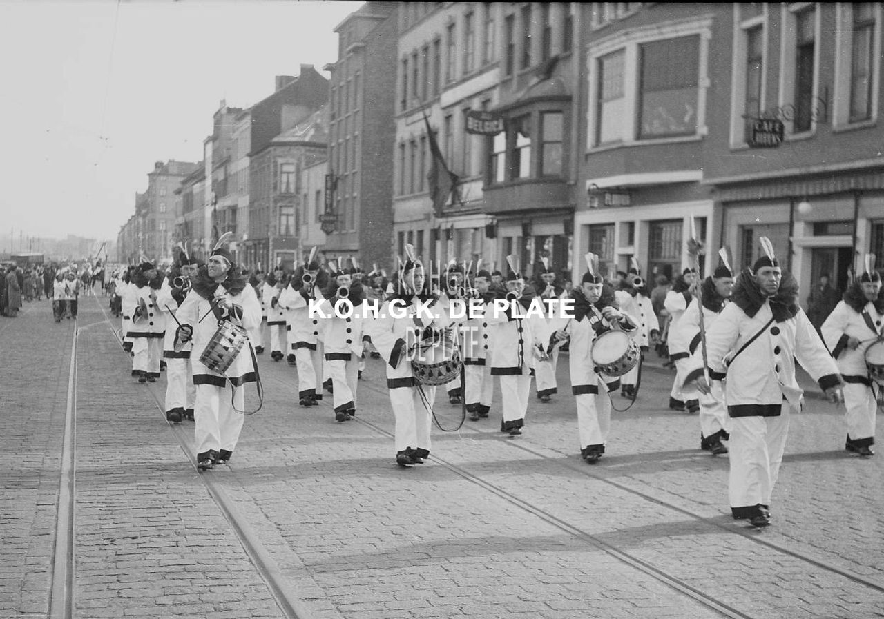 Formaat : 12,5 x 19 cm. - De stadsharmonie in pierrotpakken, gevolgd door de carnavalgroep "Het Kaartspel", op de Visserskaai