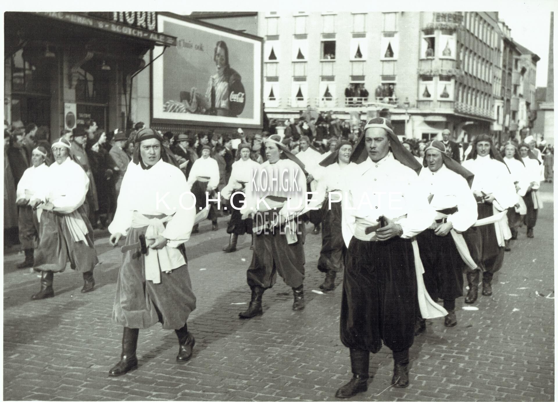 Vergroting. - Formaat : 30 x 40 cm. - De carnavalgroep "Ali Baba en de 40 rovers" op het Wapenplein. Links het hotel "Royal Nord" en ernaast reclamepaneel voor "Coca Cola".