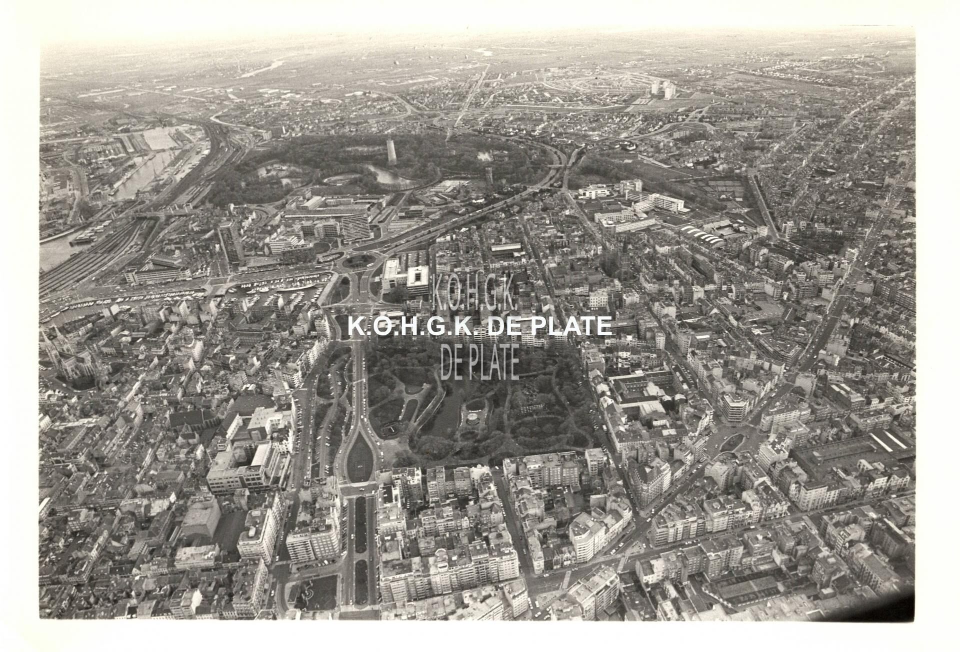 Formaat : 18 x 24 cm. Luchtfoto van het centrum met vooraan het Leopoldpark gelegen langs de Leopold II-laan. Achteraan het Maria-Hendrikapark.
