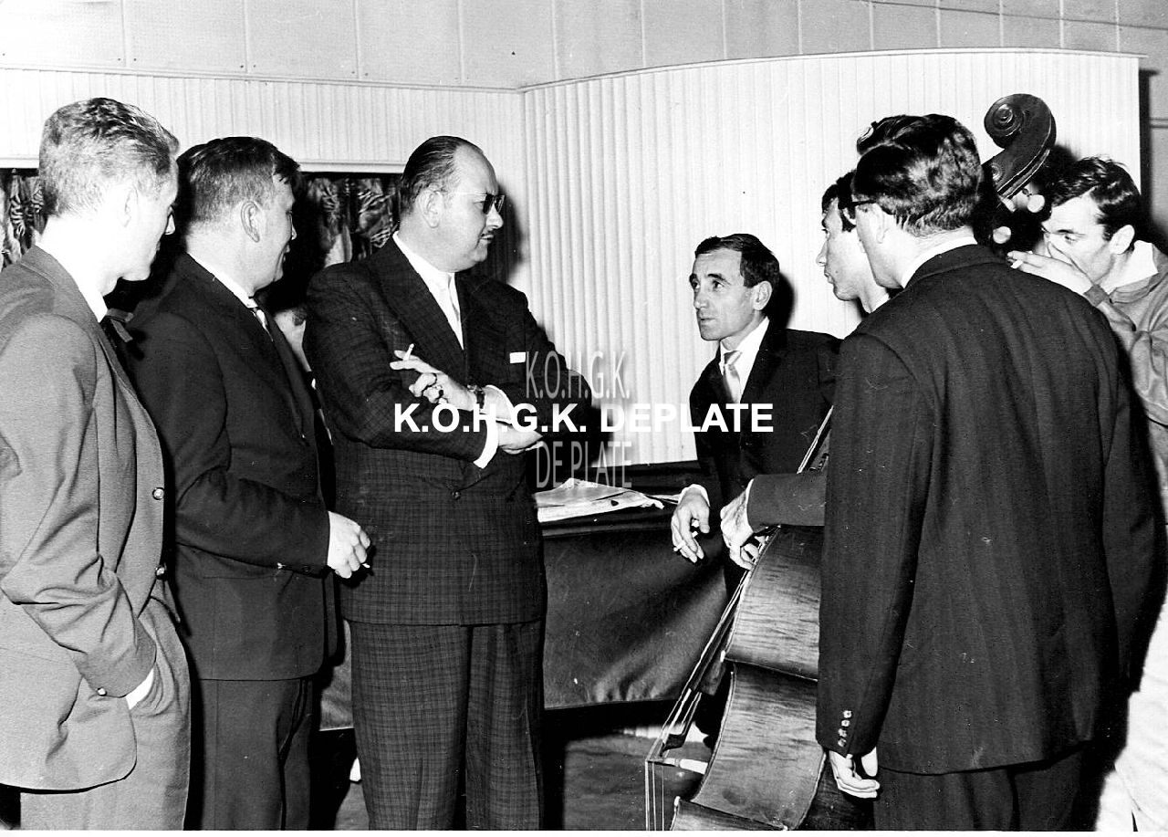 Formaat : 13 x 18 cm. - Charles Aznavour in gesprek met o.a. Roger De Ramée, directeur van het Kursaal.