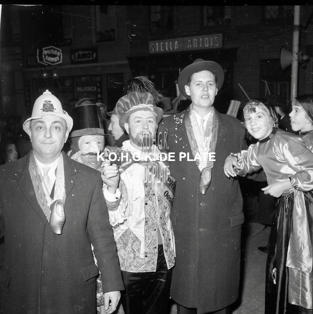 Negatief : 6 x 5,5 cm. - Theo Dehaene (links) en burgemeester Jan Piers, beiden lid van de "Orde van de Kloeffe", met in hun midden de Prins Carnaval