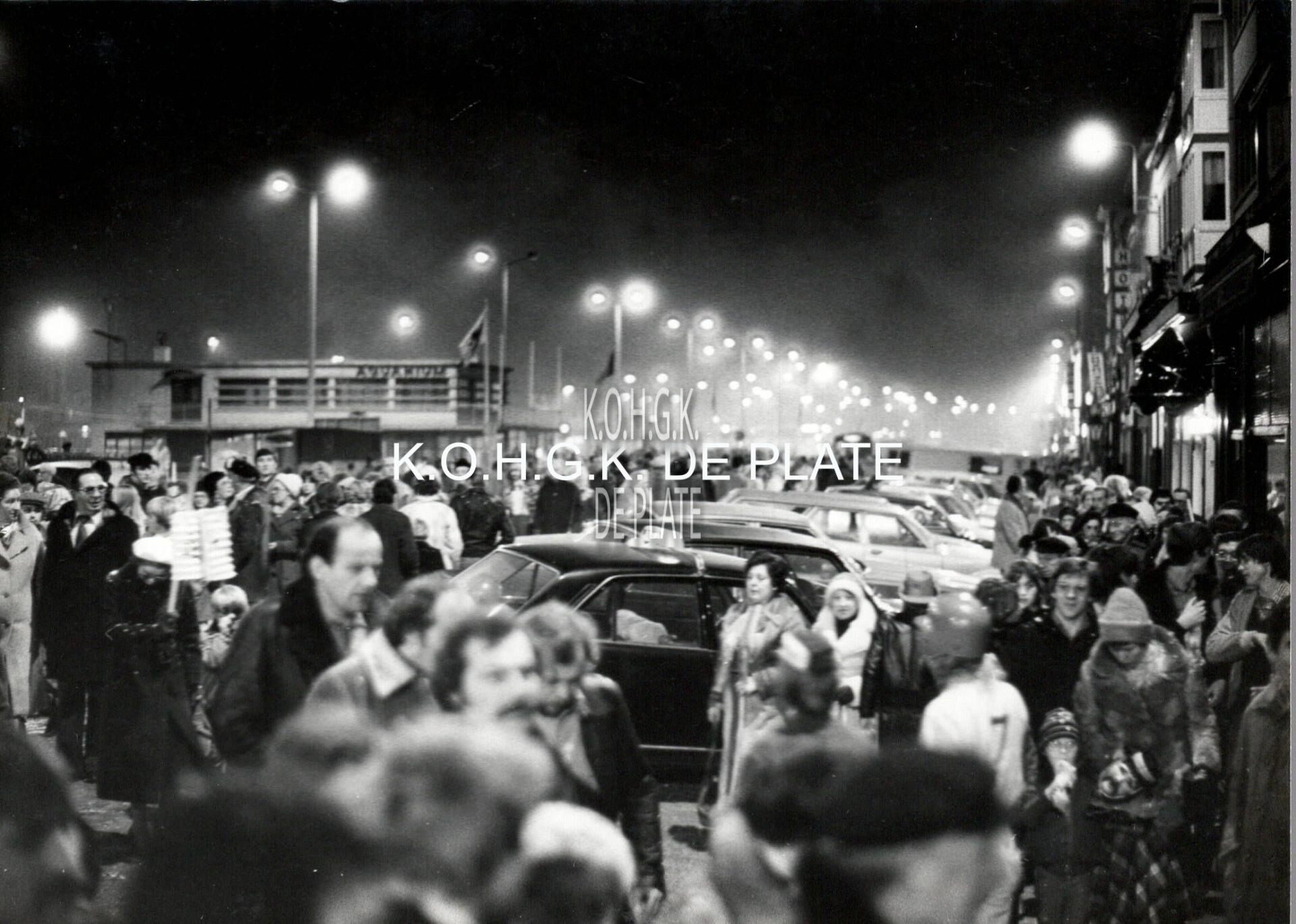 Formaat : 12,5 x 17,5 cm. - De stoet op de Visserskaai, met links het Noordzeeaquarium. Er kwam veel volk naar de stoet kijken