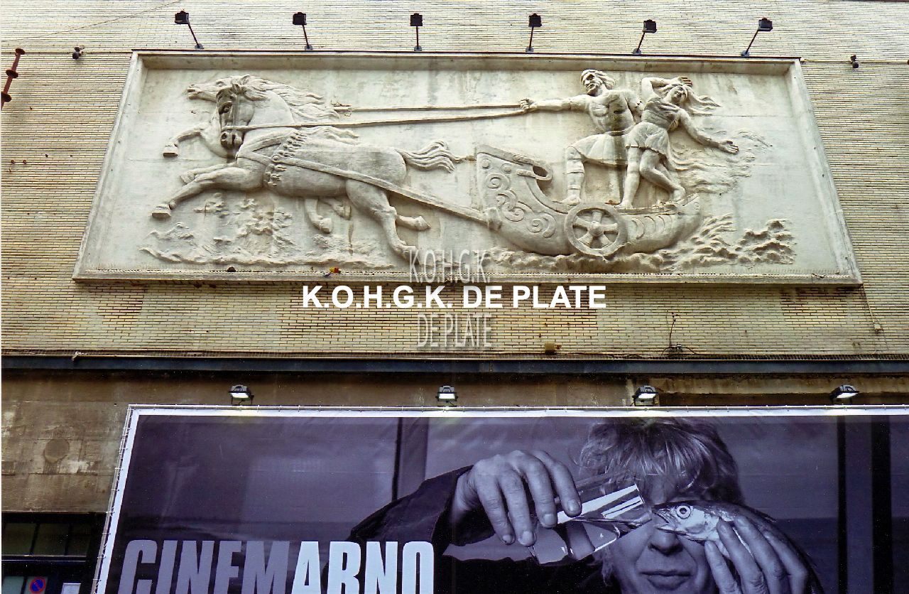 Formaat : 12,5 x 19 cm. - Opvallend is het 5,25 x 12 m grote basreliëf uit 1957 aan de gevel van een pand dat ooit Cinema Capitole was. Een spectaculaire ontvoeringscène bij de oude Romeinen ; een stoere kerel in een strijdwagen omklemt een vrouw, terwijl hij de paarden ment. Het is het werk van de Brugse beeldhouwer Michel Poppe naar een idee van Jef Hauteceur, de architect van de bioscoopzaal. Nogal kitscherig, maar wel typisch jaren 50, en wat Hollywoodachtig Ben-Huriaans. Het tafereel doet sterk denken aan die pronkerige porseleinen beeldengroepen die in die tijd in sommige Italiaanse manufacturen werden geroproduceerd. Norbert Hotyn : In : Vernieling en wederopbouw Oostende 1944 - 1958. 2019. p. 173