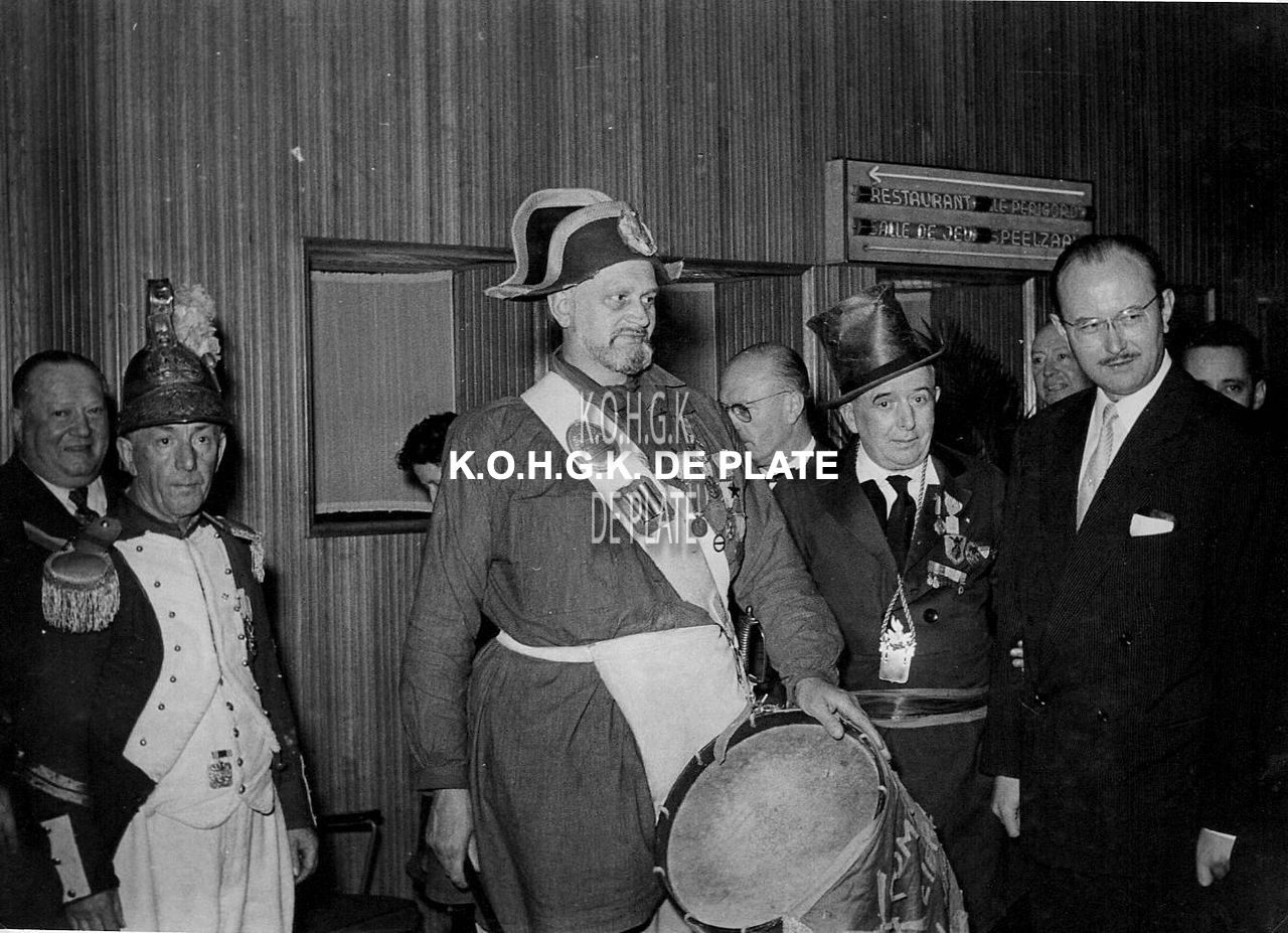 Formaat : 13 x 18 cm. - Bij hun aankomst in het Casino Kursaal Oostende. Rechts, Roger De Ramée, directeur van het Kursaal met naast hem de "burgemeester" van de vereniging.