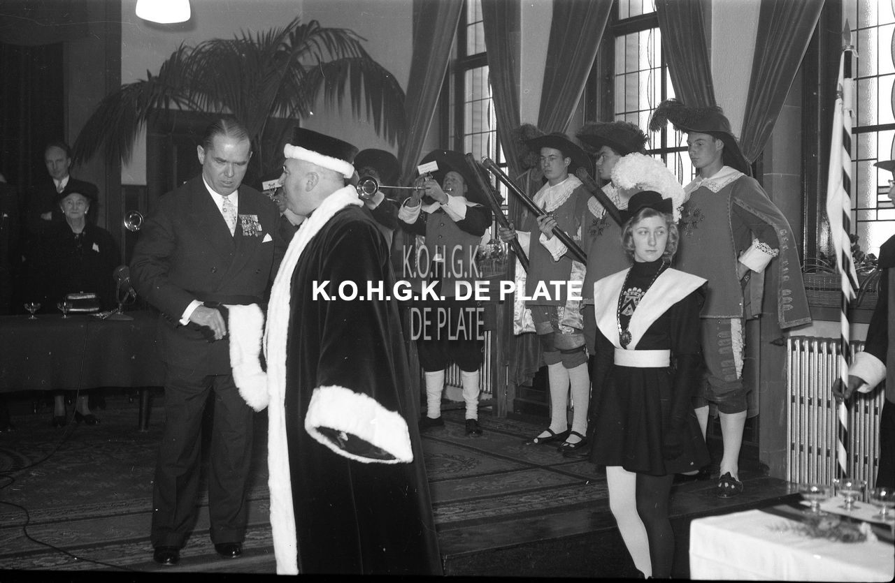Negatief : 6 x 9 cm. - Burgemeester Adolf Van Glabbeke ontvangt de "Confrérie Rat Mort" op het dienstdoend stadhuis (Gerechtshof), Hij begroet, Maurice Quaghebeur sr., Grootbaljuw en Edele Commandeur van de Hoge Raad van de Ridderschap van de Rat Mort.