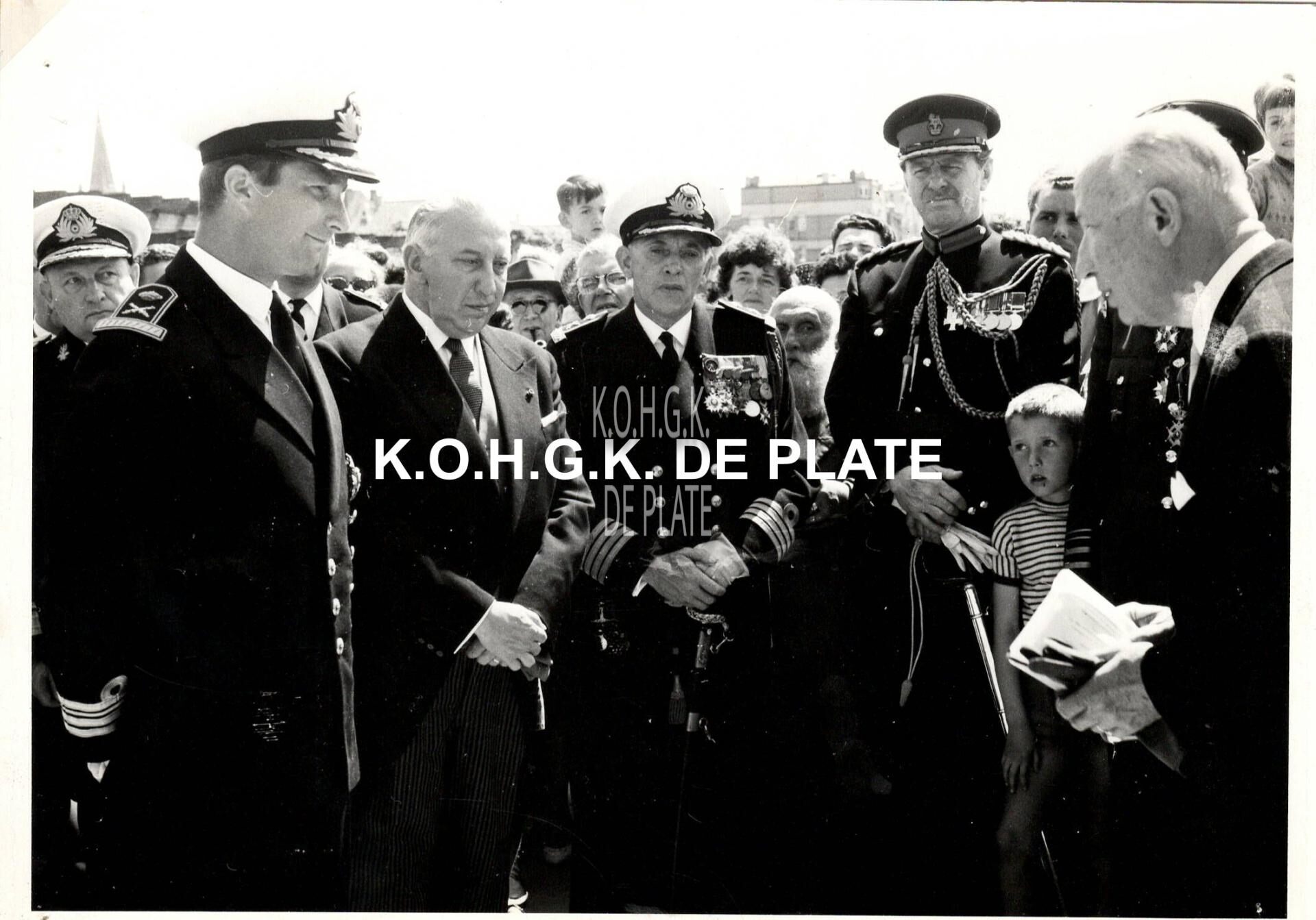 Formaat : 13 x 18 cm. - Titel onder voorbehoud, datum niet gekend (Georges Van Duyvenboden). - Ere commodore Georges Timmermans (rechts) verwelkomt de prins naar aanleiding van een tentoonstelling van de Zeemacht op de Dag van de Zeemacht. Naast de prins, de minister van landsverdediging P.W. Segers, kapitein-ter-zee Jules Delforge en een Brits militair