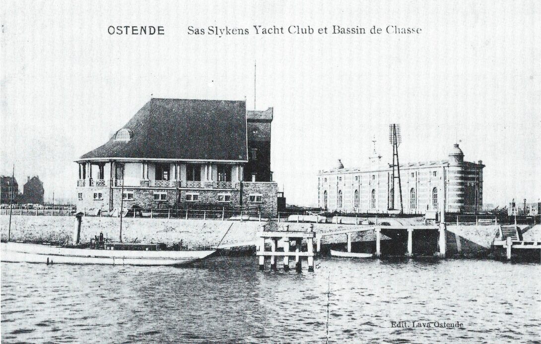 Ostende. Sas Slykens Yacht Club et Bassin de Chasse. - Op de voorgrond het clubhuis van de RYCO en rechts het gebouw met sluizencomplex van de spuikom