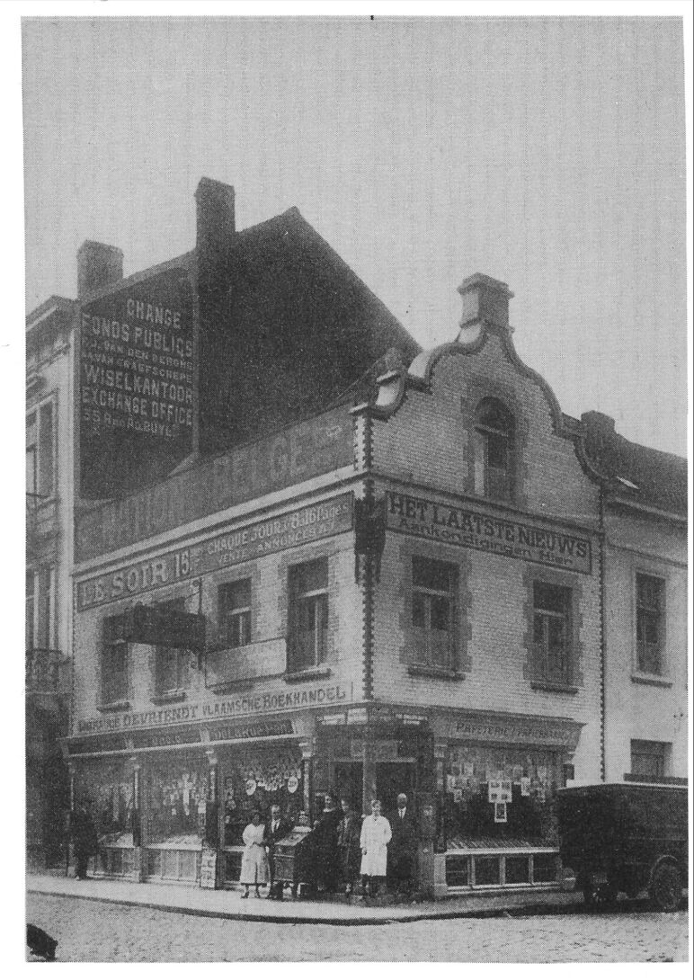 De Librairie Devriendt (Vlaamsche Boekhandel), op de hoek van de Hertstraat. De zaak werd in 1912 opgericht door Frans Devriendt