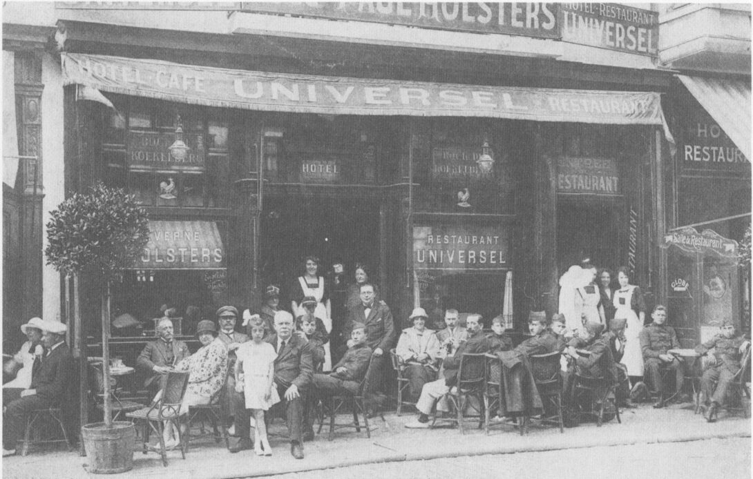 Het terras van het hotel-restaurant-café "Universel" in de Adolf Buylstraat. Dit hotel werd toen uitgebaat door de heer P. Holsters.