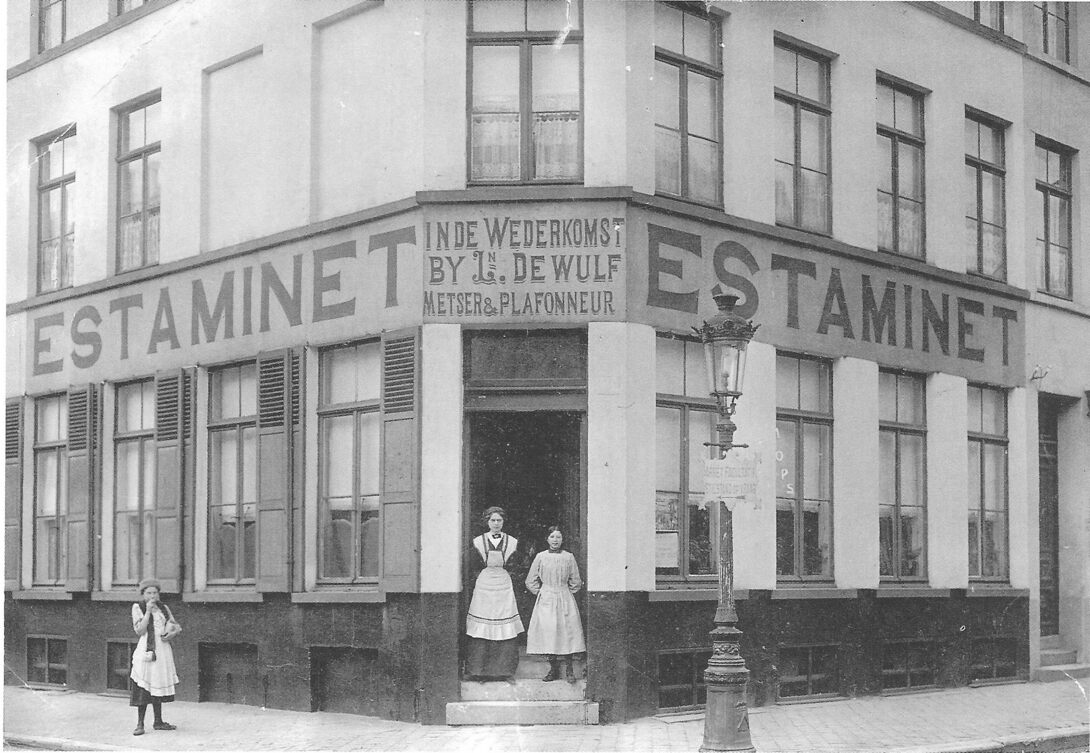 Het estaminet "In de Wederkomst", was gelegen op de hoek van de Alfons Pieterslaan (rechts) en de Sint-Peterburgstraat (links). Het werd uitgebaat door Leonce Dewulf die terzelfdertijd "metser en plafonneur" was. Het bord aan de lantaarnpaal wijst naar een tramhalte op aanvraag. De Alfons Pieterslaan, vroeger Zuidlaan of Boulevard du Midi, kreeg zijn naam vanaf 31 mei 1912. De Sint-Peterburgstraat veranderde vanaf 1953 in Leon Spilliaertstraat.
