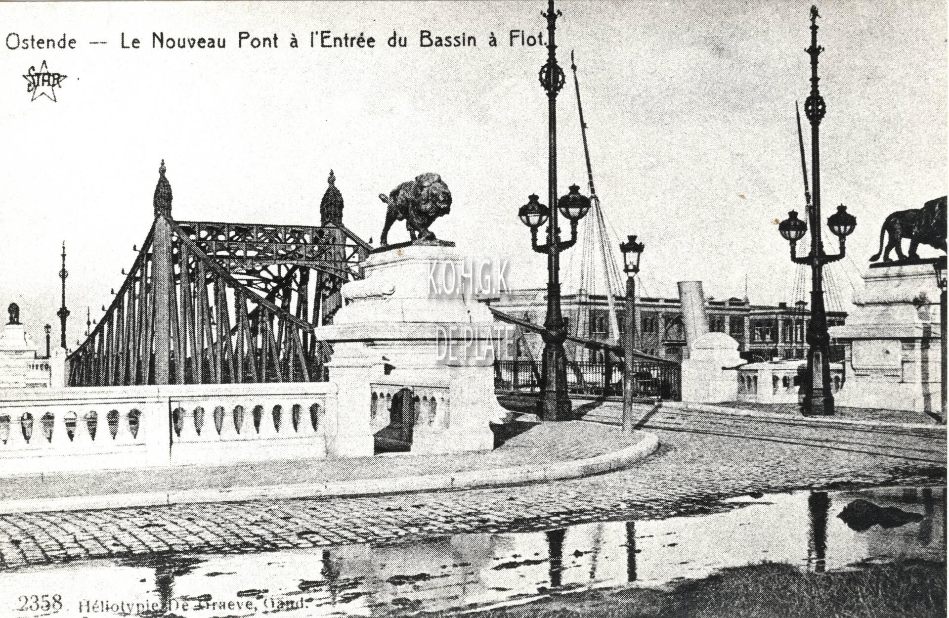 Afdruk van postkaart Star, N° 2358, formaat : 9 x 14 cm. - Ostende - Le Nouveau Pont à l'Entrée du Bassin à Vlot. - De Demeybrug over de zeesluis Demey, die het Vlotdok verbindt met de havengeul. De bronzen beelden werden door de Duitse bezetter tijdens de Eerste Wereldoorlog weggenomen