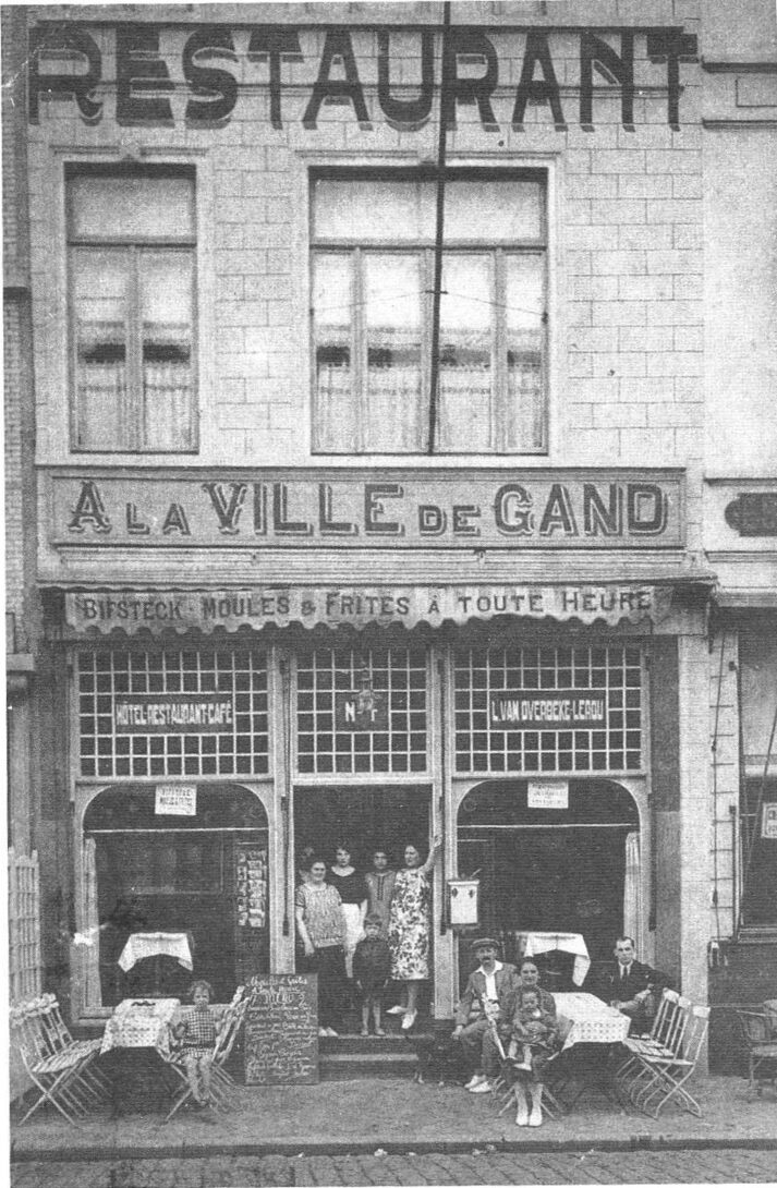 Het restaurant A la Ville de Gand, gevestigd in de Graaf de Smet de Naeyerlaan nr. 4 en toen uitgebaat door het echtpaar L. Van Overbeke-Lerou.
