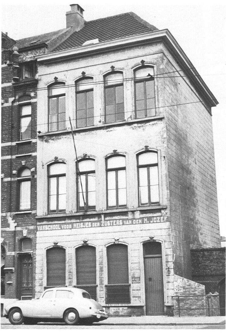 Het leegstaand pand van de vakschool voor meisjes der Zusters van de H. Jozef, gelegen aan de de Smet de Naeyerlaan, links van de kerk van de O.L. Vrouw Onbevlekte Ontvangenis