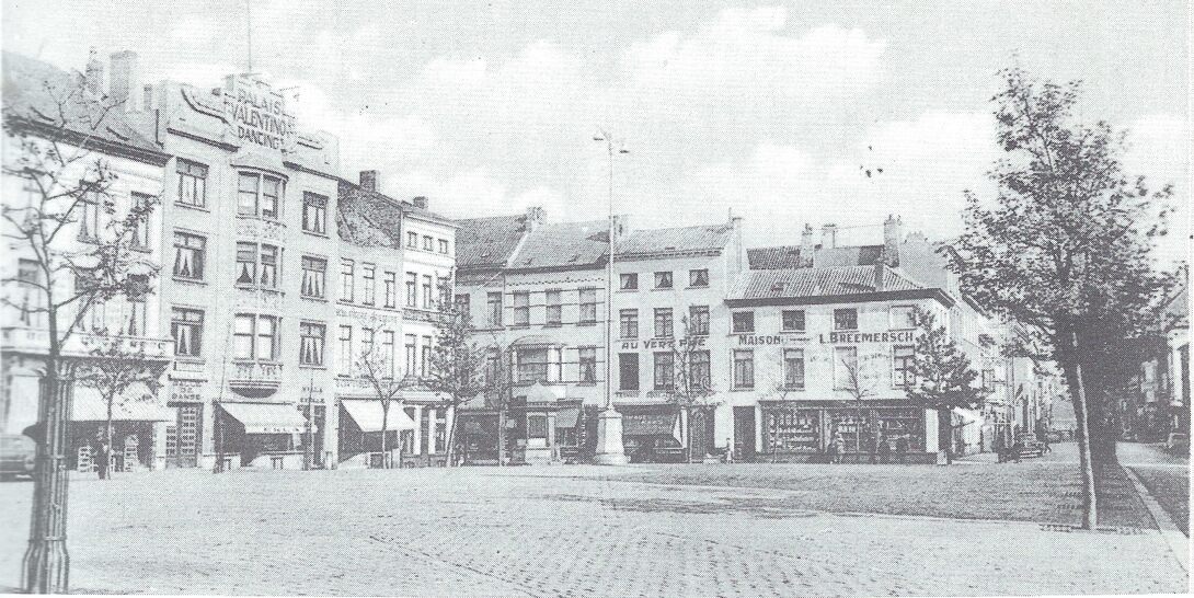 Het tweede gebouw van links, was de gekende dancing "Valentino" die haar deuren sloot in 1960. Rechts, op de hoek van de Kaaistraat, de porseleinenwinkel Breemersch en links ervan de kaaswinkel "Au Vert Pré"