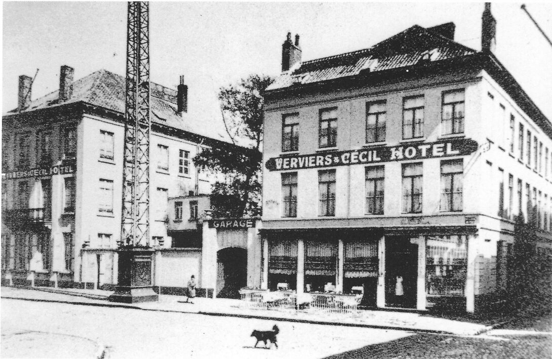 Het "Verviers et Cécil Hôtel", gelegen op de hoek met de Kapucijnenstraat (rechts). Detail van een telefoonpyloon