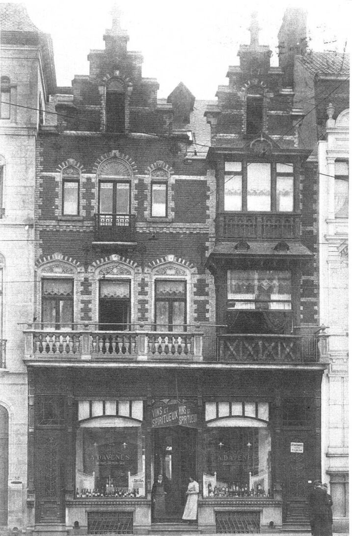 De wijn- en likeurzaak van de heer Auguste Davènes was gelegen in de Koningsstraat nr. 34, in het gedeelte tussen de Ijzerstraat (links) en de Van Iseghemlaan (rechts)