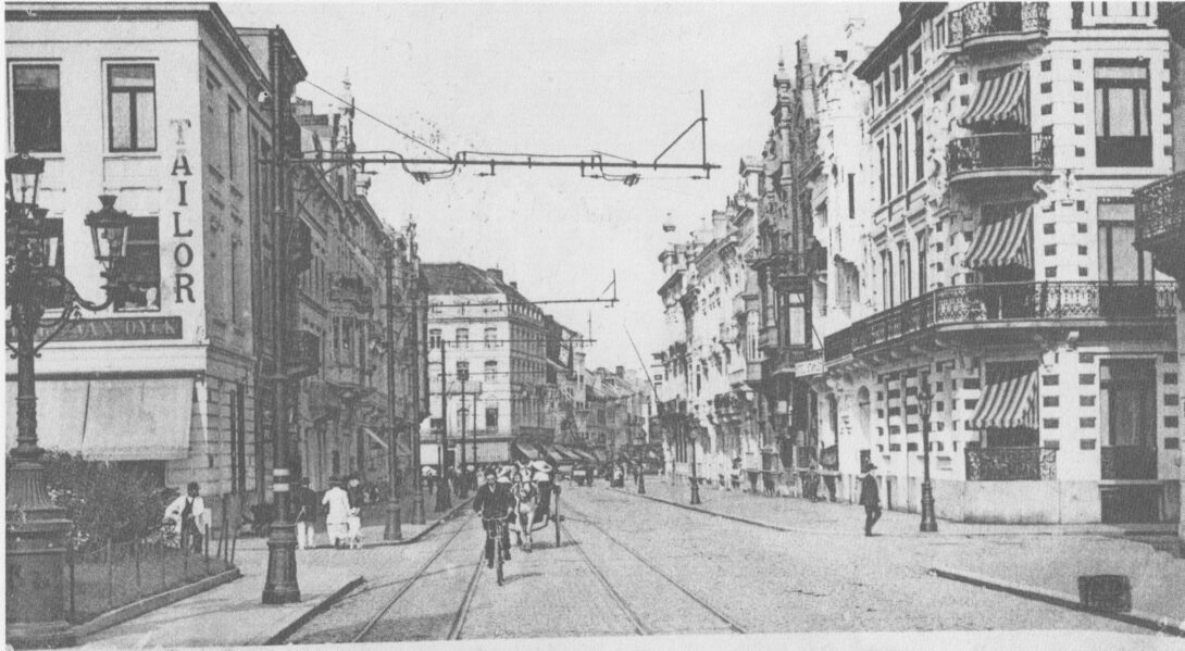 Gedeelte van de Koningsstraat gezien vanaf de Ijzerstraat, richting Marie-Joséplein. Centraal op de achtergrond, de Banque Elleboudt, het latere Hotel du Parc