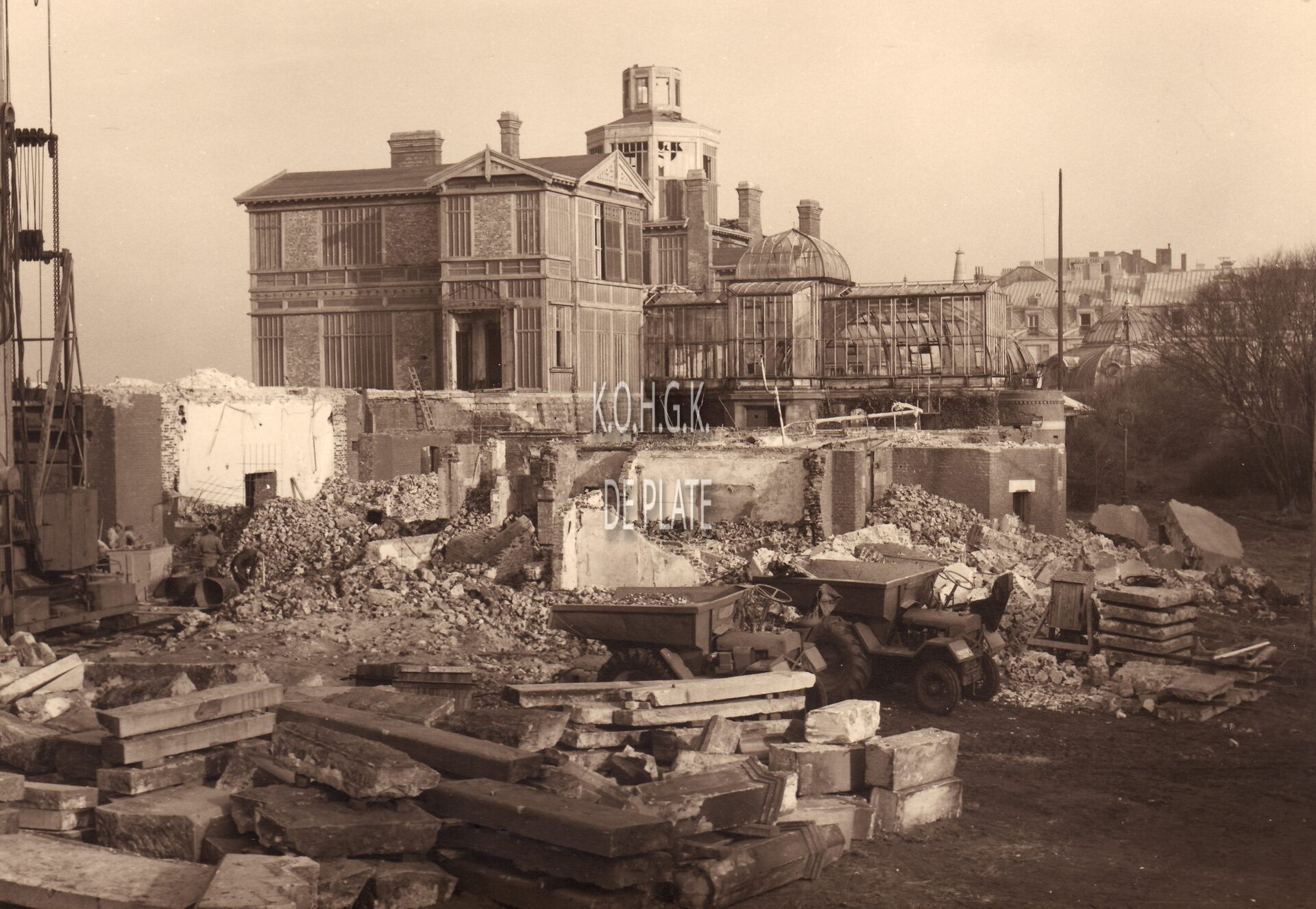 Formaat : 13 x 18 cm. - Zicht op de werf tijdens de sloop van de puinen van de koninklijke villa na de Tweede Wereldoorlog. Op de achtergrond de Parijsstraat.