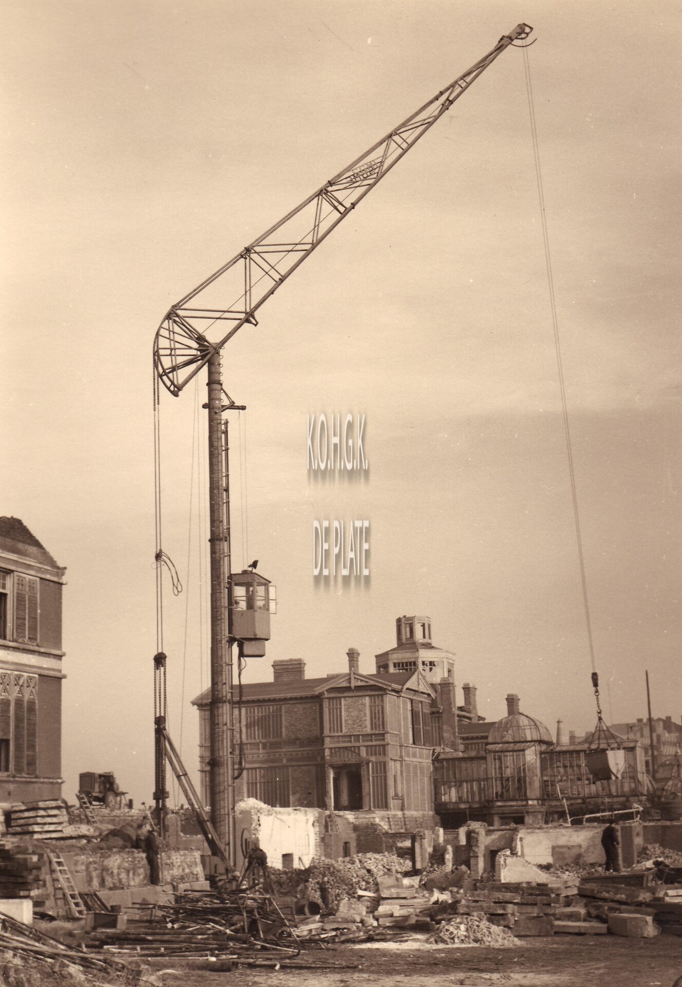 Formaat : 18 x 13 cm. - Zicht op de werf met kraan van de bouwonderneming Wwe J. Van Coillie, tijdens de sloop van de puinen van de koninklijke villa na de Tweede Wereldoorlog.