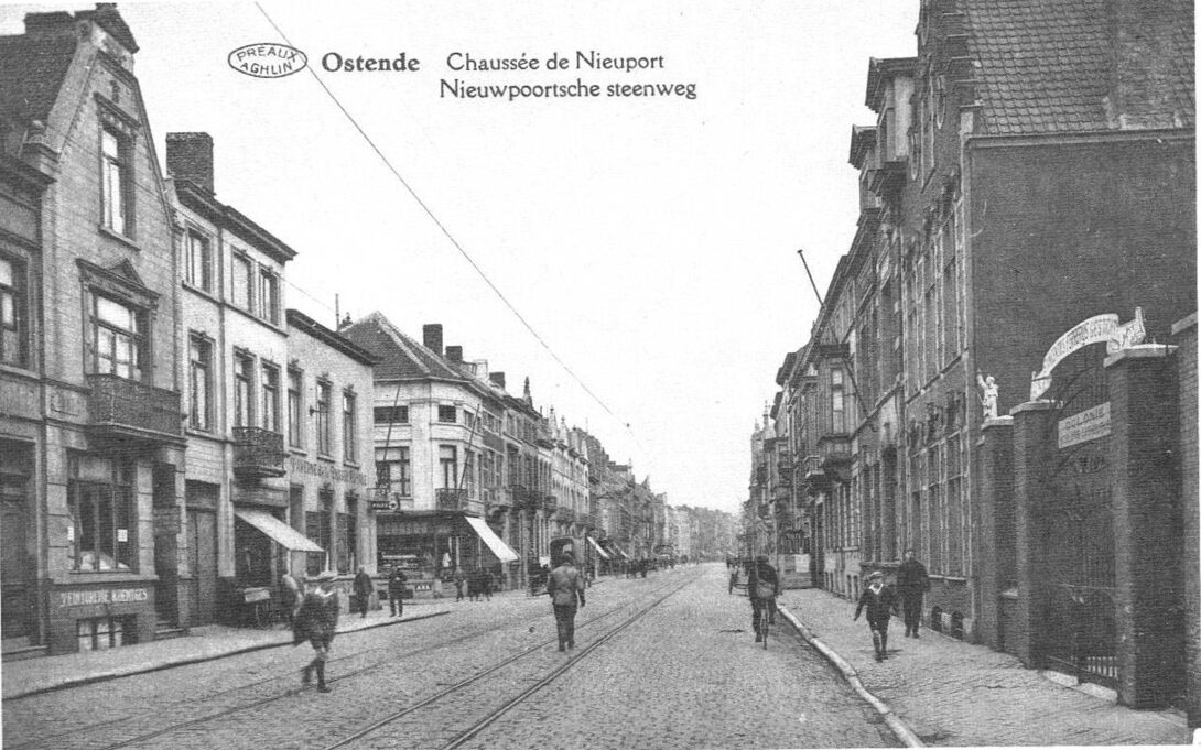 De noordkant van de Nieuwpoortsesteenweg ter hoogte van de Sint Jozefskliniek, richting Petit Paris. Uiterst rechts op de foto, de ingang van het Sint Vincentius Ferrerius wezenhuis.