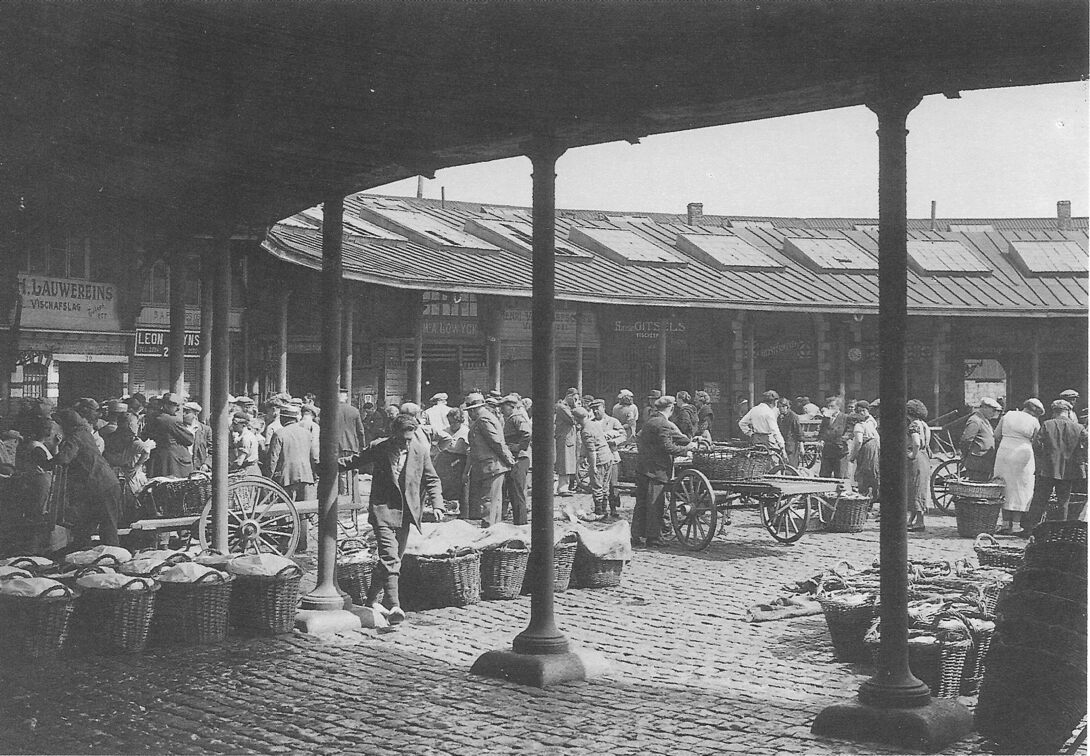 Stemmig beeld van de activiteit in de oude vismijn. Links, het pakhuis van vishandelaar H. Lauwereins.