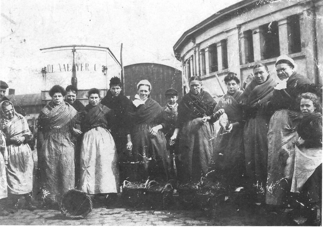 Vissersvrouwen poseren voor de oude vismijn. Omwille van de ronde vorm van het compleks kreeg de vismijn de bijnaam "De Cirk".