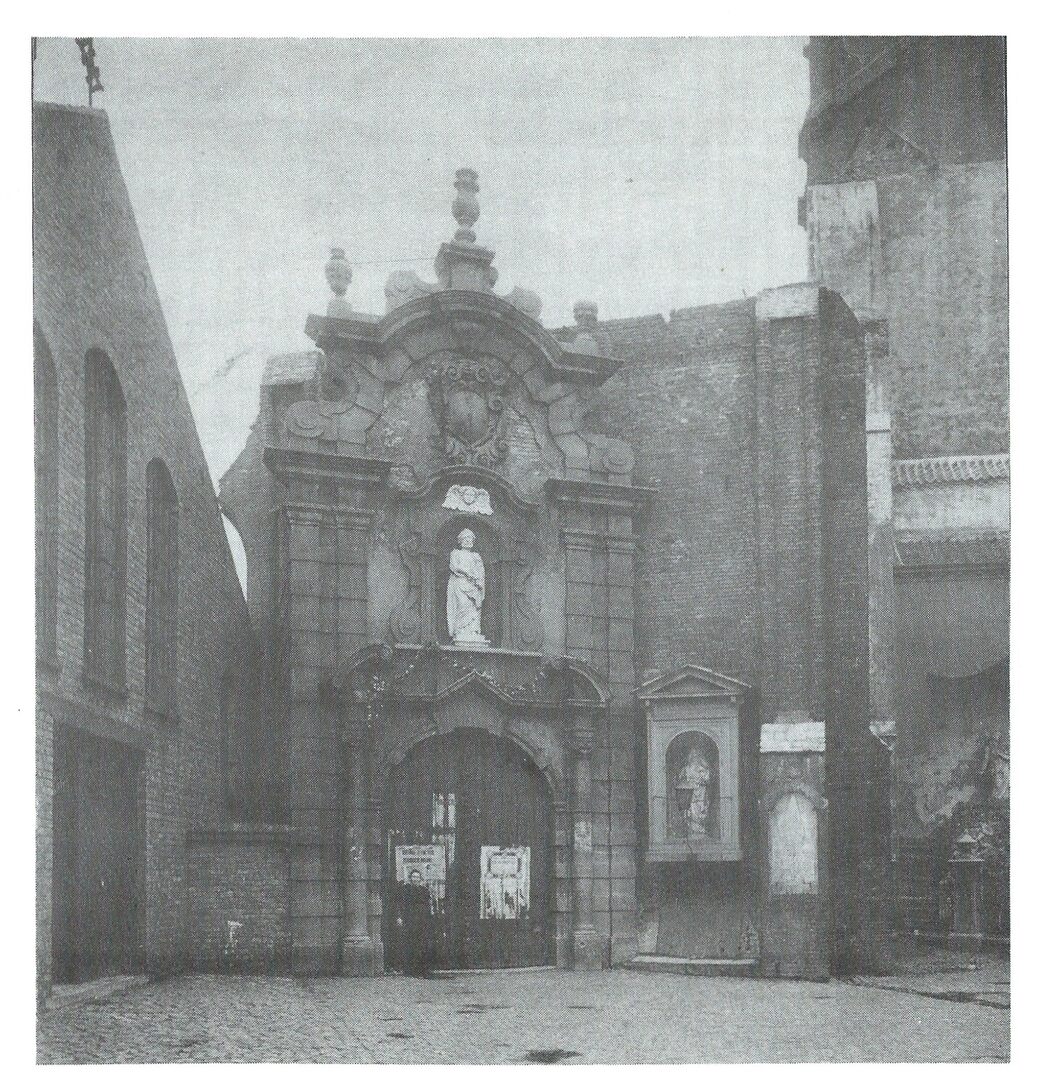 Op 14 augustus 1896 brandde de Sint Pieterskerk bijna volledig af. Links, de Noodkerk, waar de erediensten werden gehouden totdat de nieuwe hoofdkerk voltooid was. Centraal, het portaal van de kerk, dat later steen voor steen zorgvuldig werd losgekapt om heropgebouwd te worden aan de zijkant van de oude toren, genaamd de Peperbusse.