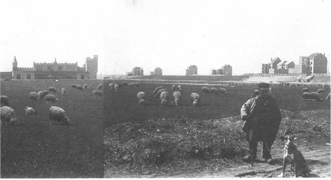 De Tir Aux Pigeons (Duivenschieting) naast de Wellingtonrenbaan. Rechts, de achterkant van de Zeedijk, toen nog grotendeels onbebouwd