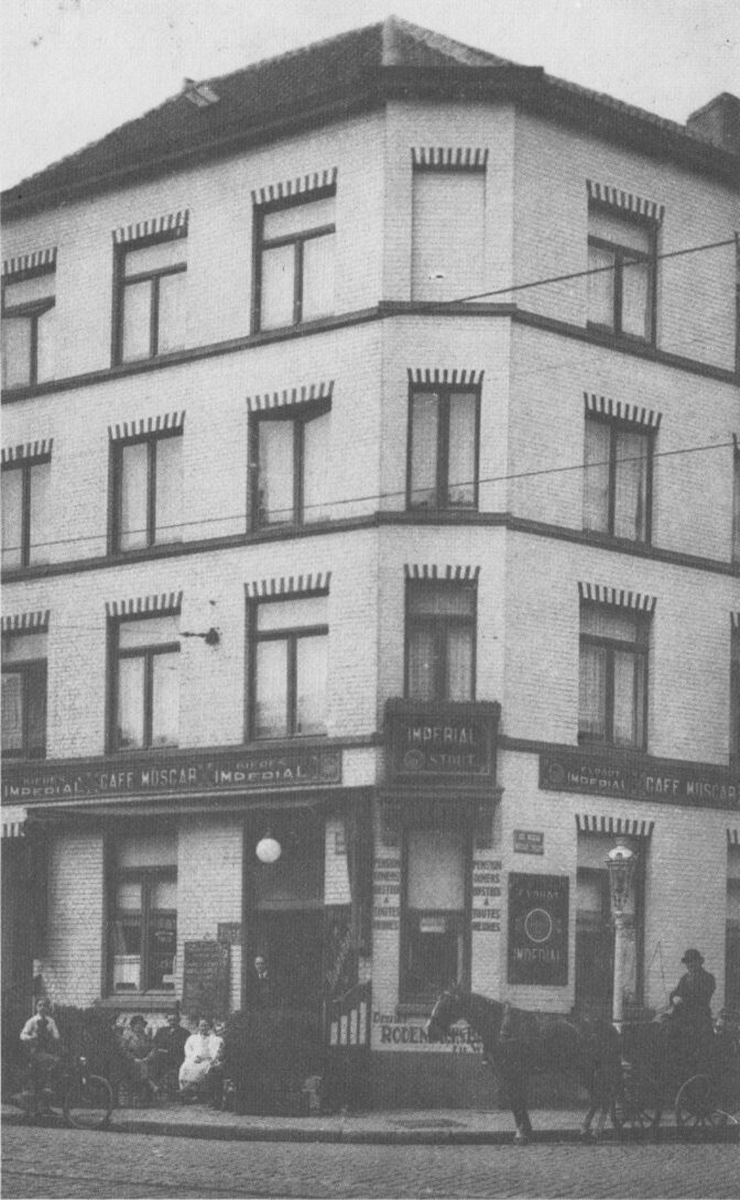 Het Café-Restaurant-Pension Muscar, gelegen op de hoek van de Torhoutsesteenweg (links) en de Muscarstraat