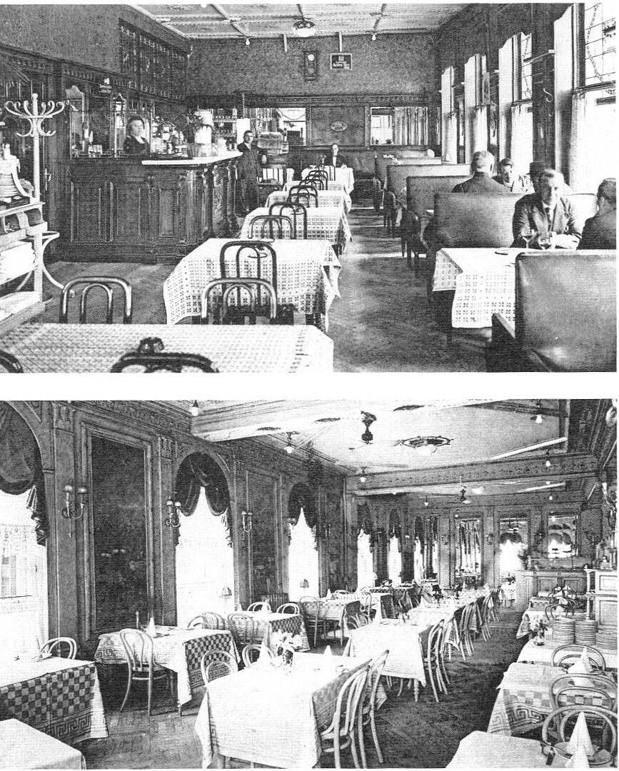 Twee binnenzichten van het Hotel de la Couronne. Bovenaan de bar en onderaan het restaurant