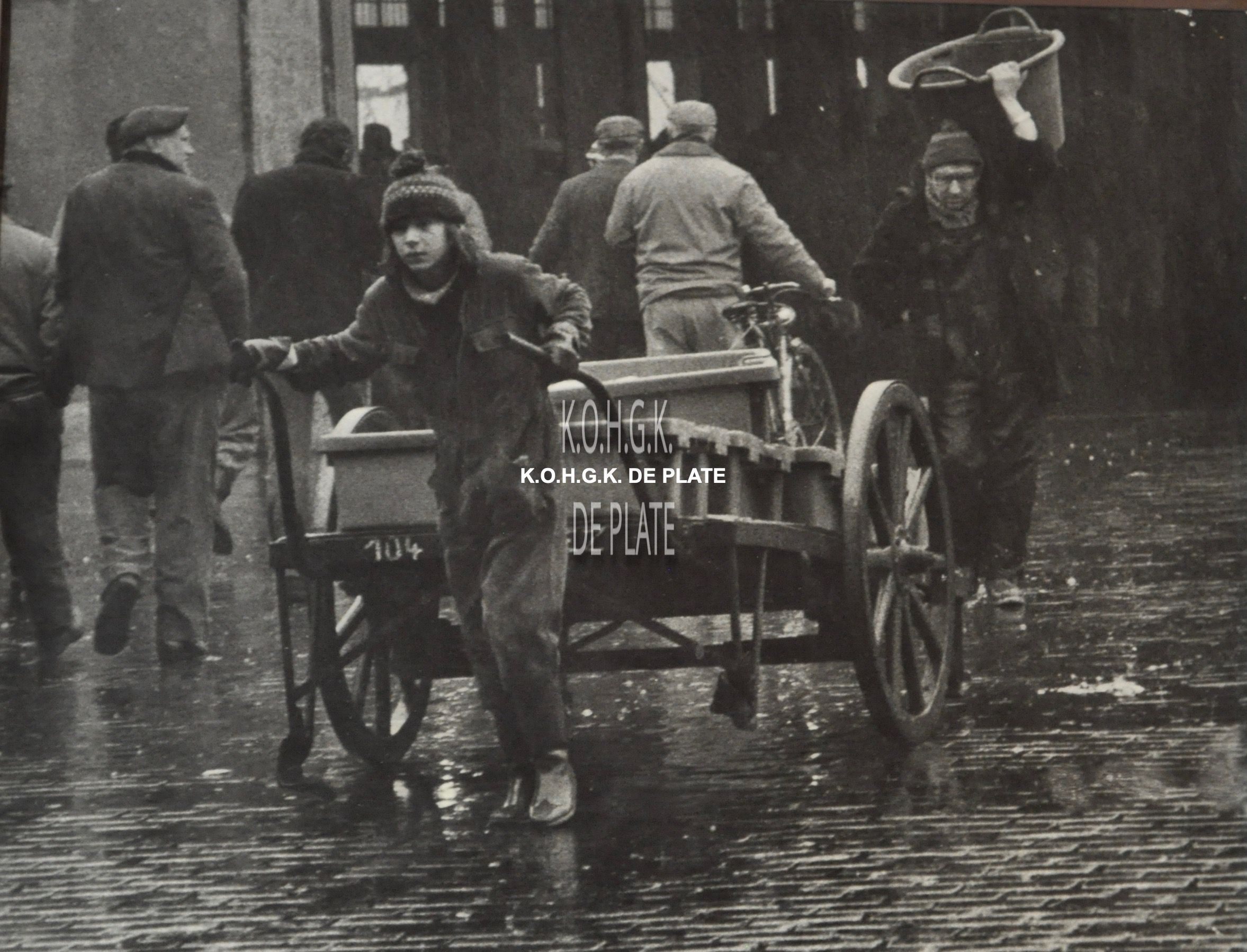 Binnenzicht van de vismijn. Op de voorgrond Pierre…. met stootkar