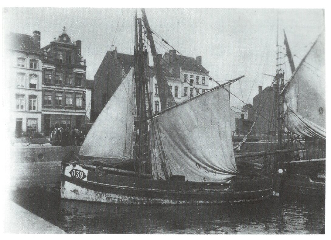Aangemeerd de O.39 "Noordzee" van reder Auguste Hamman (Rapport sur l'administration et la situation des affaires de la ville d'Ostende. 1898, p. 156). Gedeelte van de Visserskaai tussen de Nieuw- en de Cirkelstraat.
