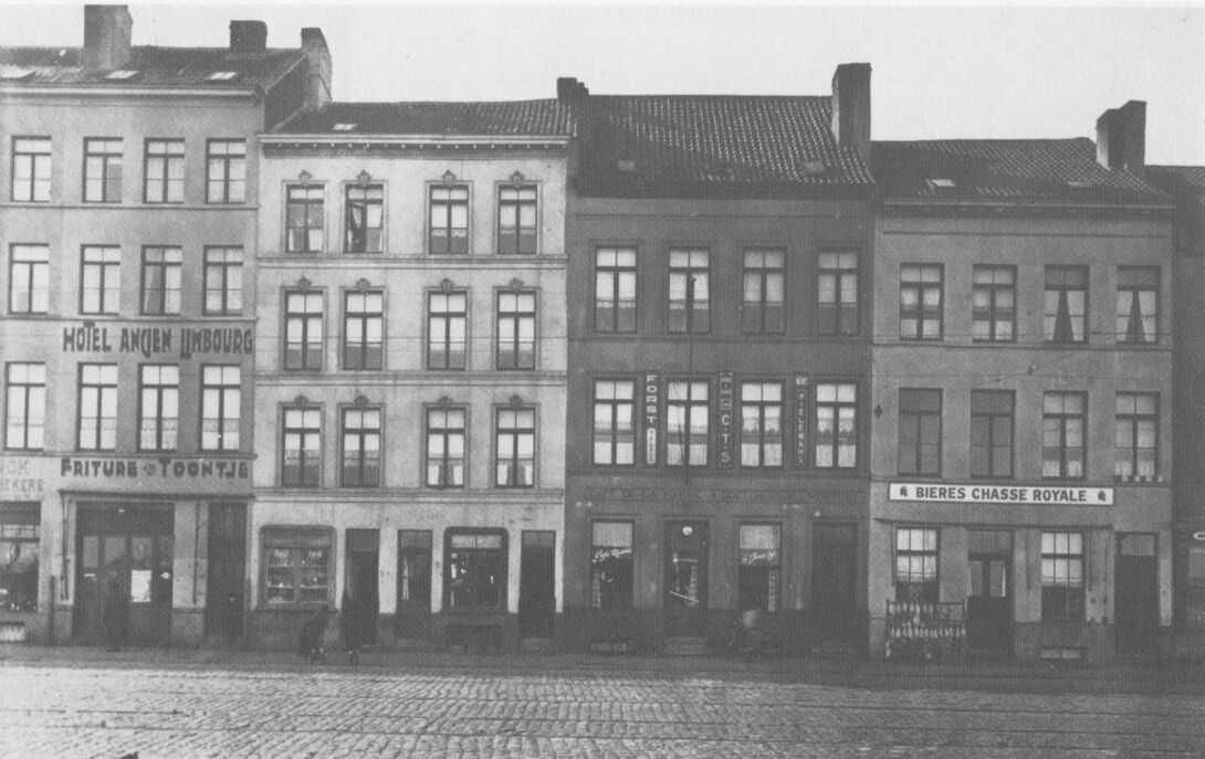 Derde gedeelte van de huizenrij tusssen de Sint-Paulusstraat (links) richting Ooststraat (rechts). Op de foto van links naar rechts : Het hotel Ancien Limbourg / Friture Toontje, een kruidenierswinkel, café van Valère Van Outryve, het café De la Marine (1) en een café.