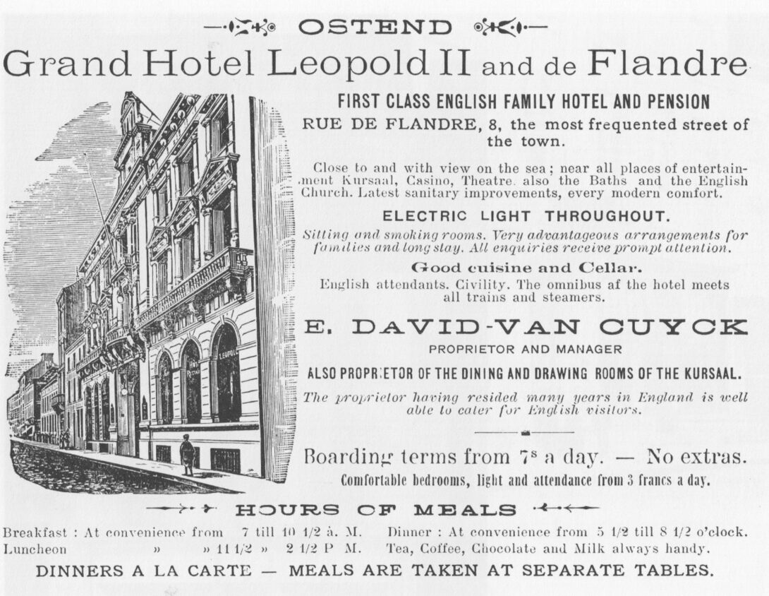 Reklamekaart van het Grand Hotel Leopold II et de Flandre. Dit hotel was gelegen in de Vlaanderenstraat in het gedeelte tussen het Wapenplein (links) en de Langestraat (rechts). Het werd toen uitgebaat door het echtpaar Eduardus David-Maria Van Cuyck