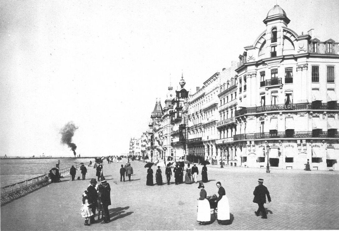 De Zeedijk gezien vanaf de Kursaal-Oosthelling richting klein strand. Links van het Hotel Royal Belge : het Hotel de Belle Vue, het Grand Hotel d'Ostende en het Hotel du Littoral