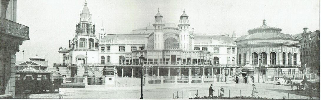 De hoofdingang van de derde Kursaal gelegen langs de Van Iseghemlaan. Links, detail van een stadstram