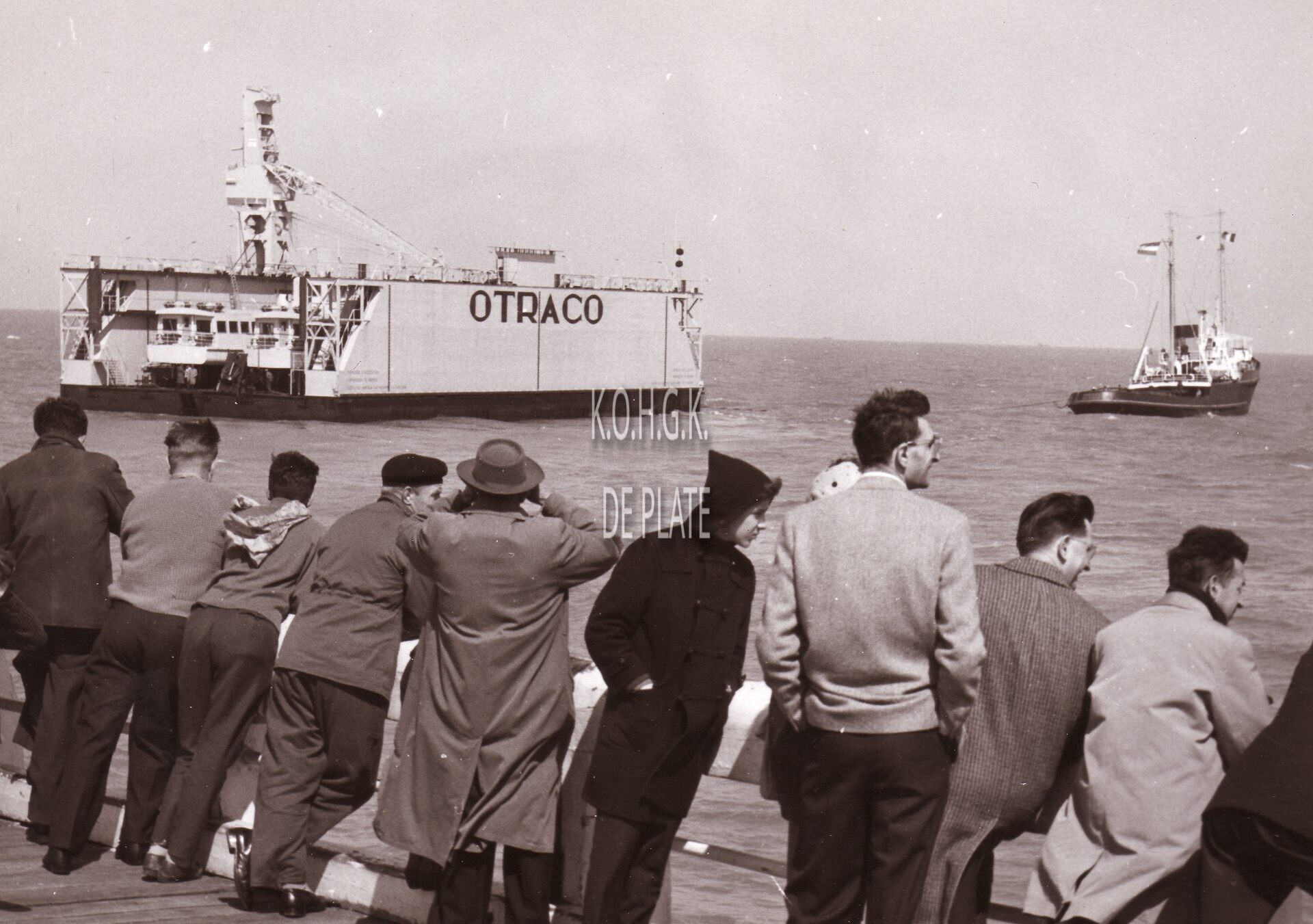 Formaat : 13 x 18 cm. - Het droogdok van de firma OTRACO op sleep door de Nederlandse zeesleepboot Oostzee naar Belgisch Congo.